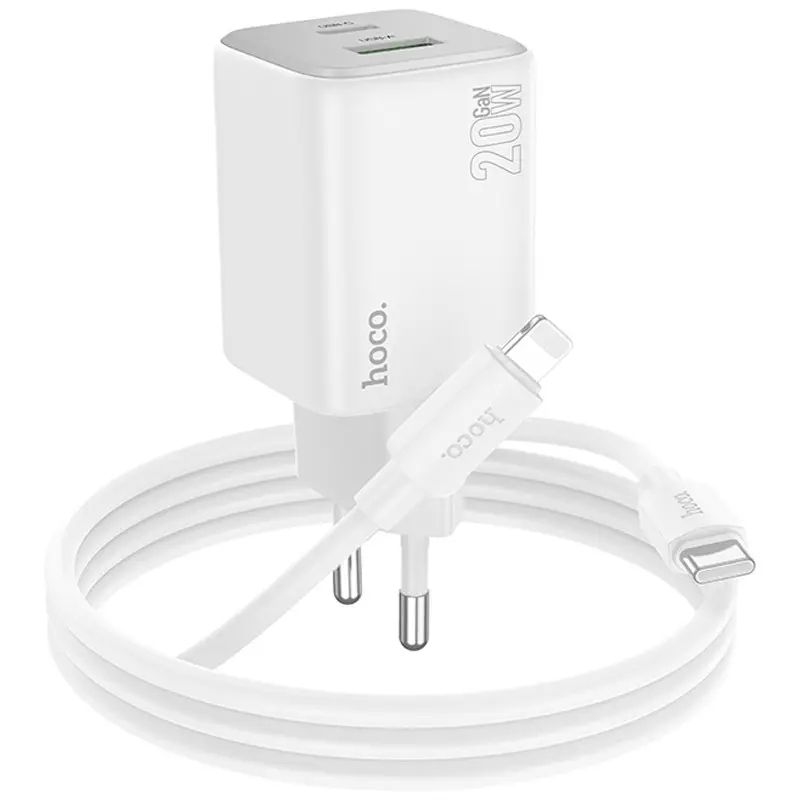 Мережевий зарядний пристрій Hoco N41, USB, Type-C, 20W, 3А, PD, QC, white, кабель Type-C to Lightning