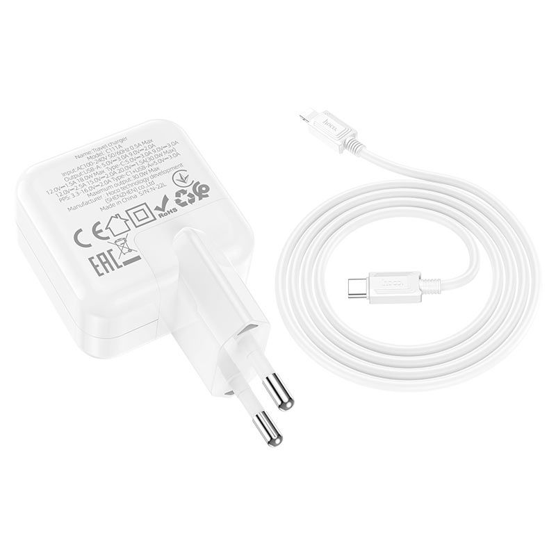 Мережевий зарядний пристрій Hoco C111A Lucky, PD30W, QC3.0, кабель Type-C to Lightning, Білий