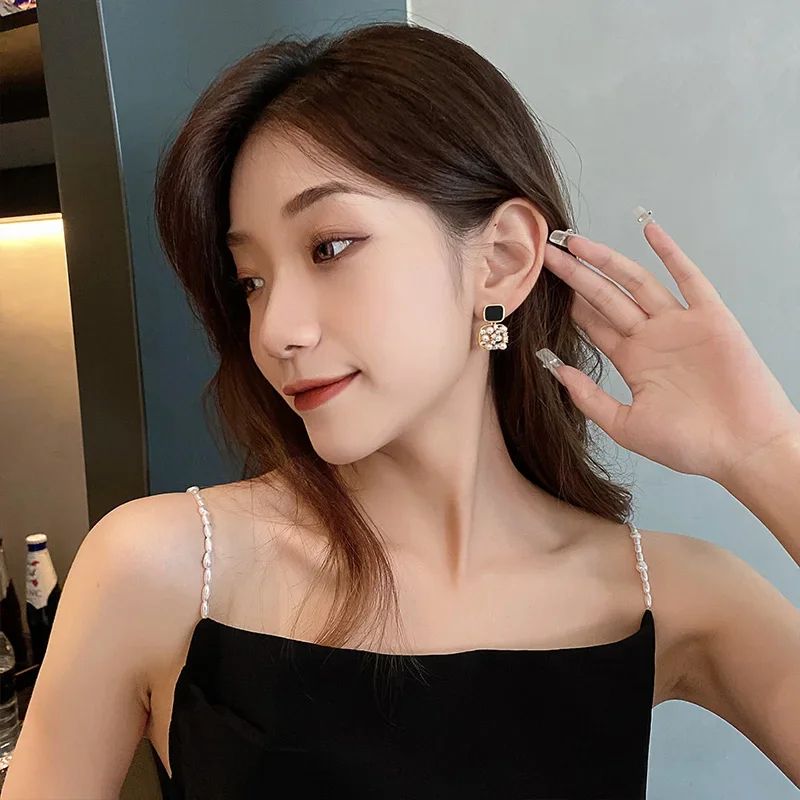 Сережки перлини у формі квадрата кубічний цирконій з перлинами чорні