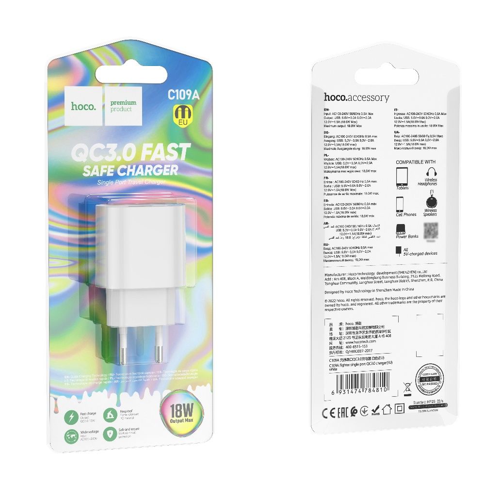 Мережевий зарядний пристрій Hoco C109A — це компактне, надійне та високоефективне рішення для швидкої та безпечної зарядки сучасних гаджетів. Модель підтримує технології швидкого заряджання Quick Charge, FCP та AFC, забезпечуючи стабільну подачу потужності та скорочуючи час заряджання.