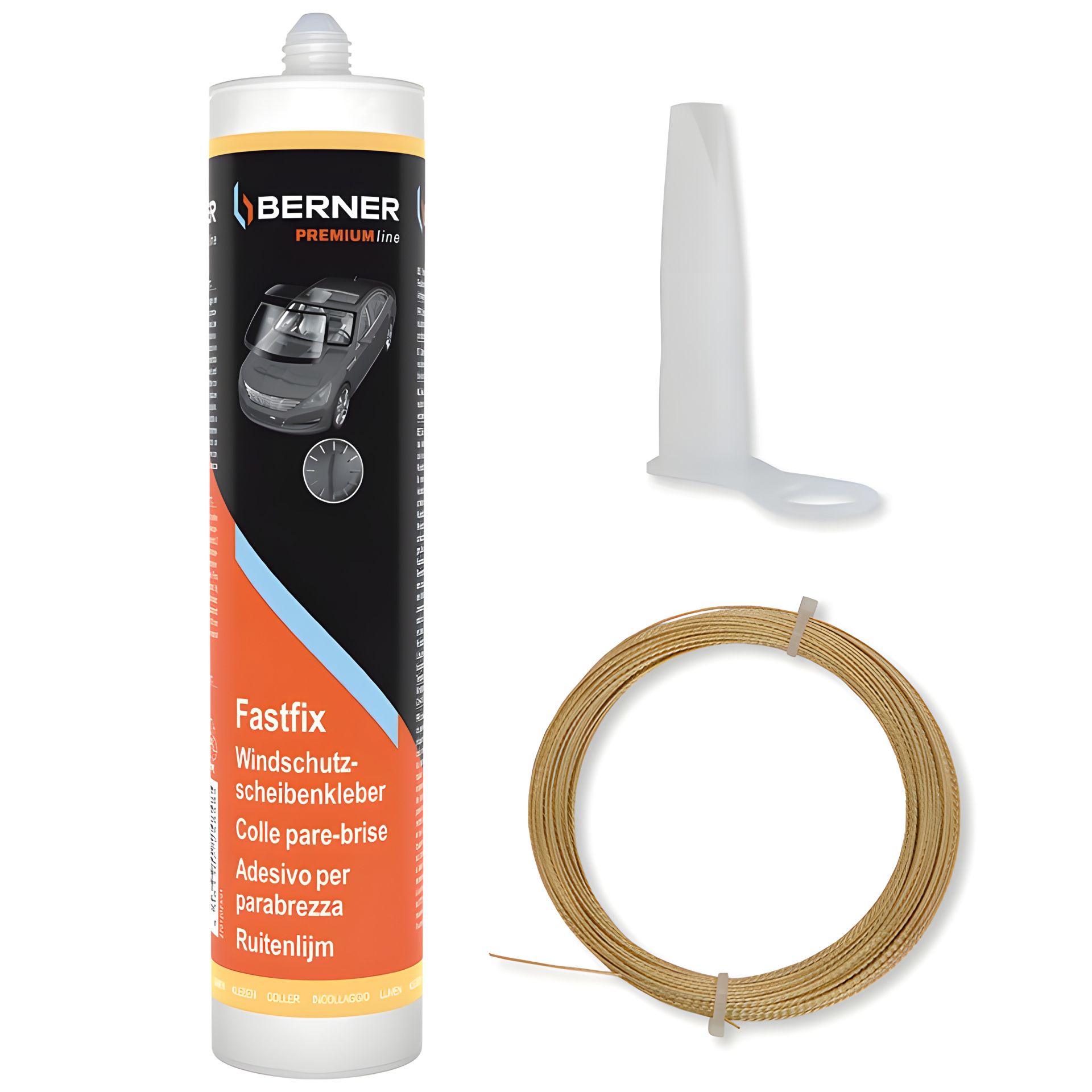 Готовий набір для швидкої та безпечної заміни лобового скла: клей Fastfix Premium, V-подібний носик та струна для вирізання скла 1,2 м.