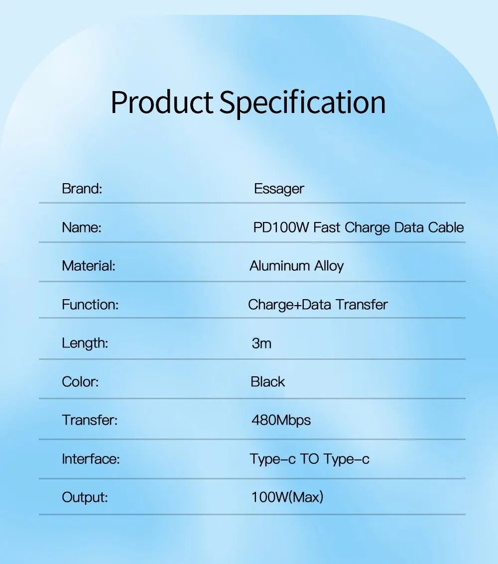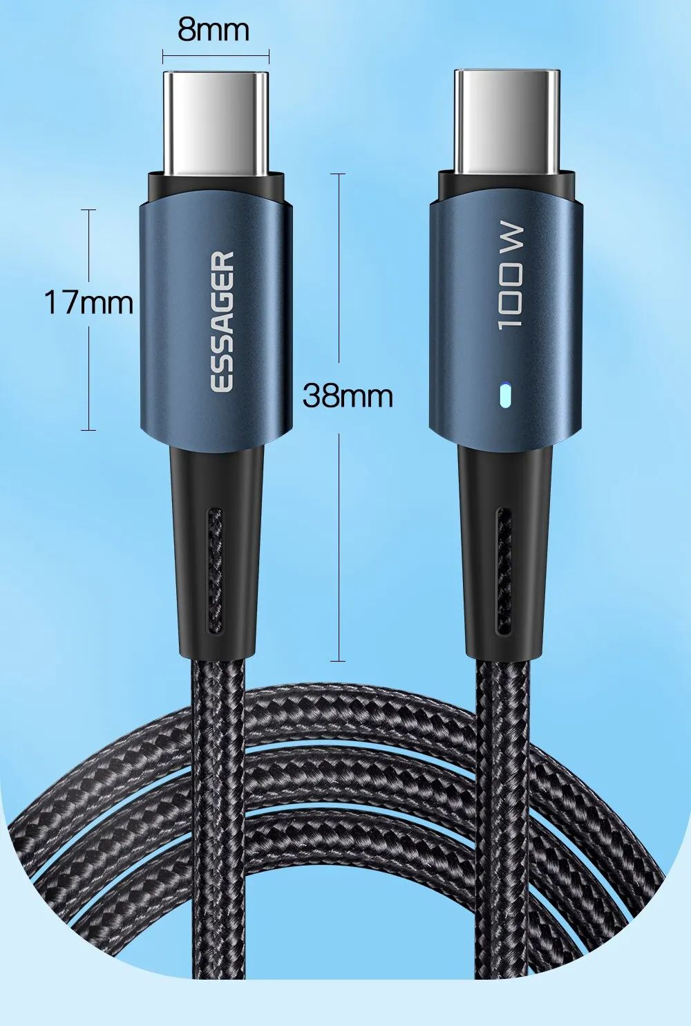 Кабель Essager, 100W, Type-C - Type-C, 3m, black, з індикатором