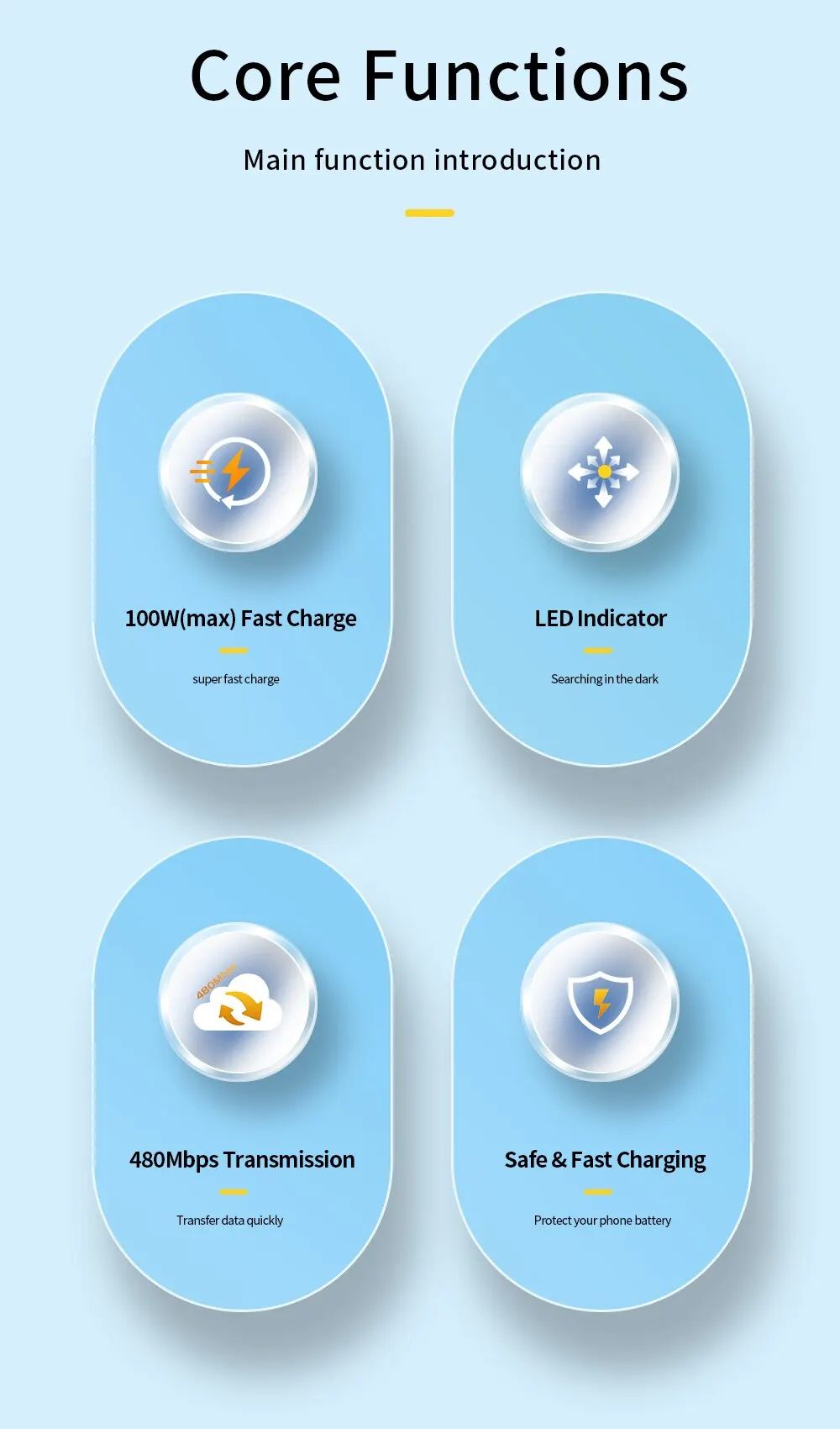 Це надійне рішення для швидкого заряджання та передачі даних. Цей кабель підтримує сучасні протоколи швидкого заряджання, забезпечує потужність до 100 Вт та швидкість передачі даних до 480 Мбіт/с, що робить його універсальним аксесуаром для смартфонів, планшетів, ноутбуків та інших пристроїв з роз'ємом Type-C.