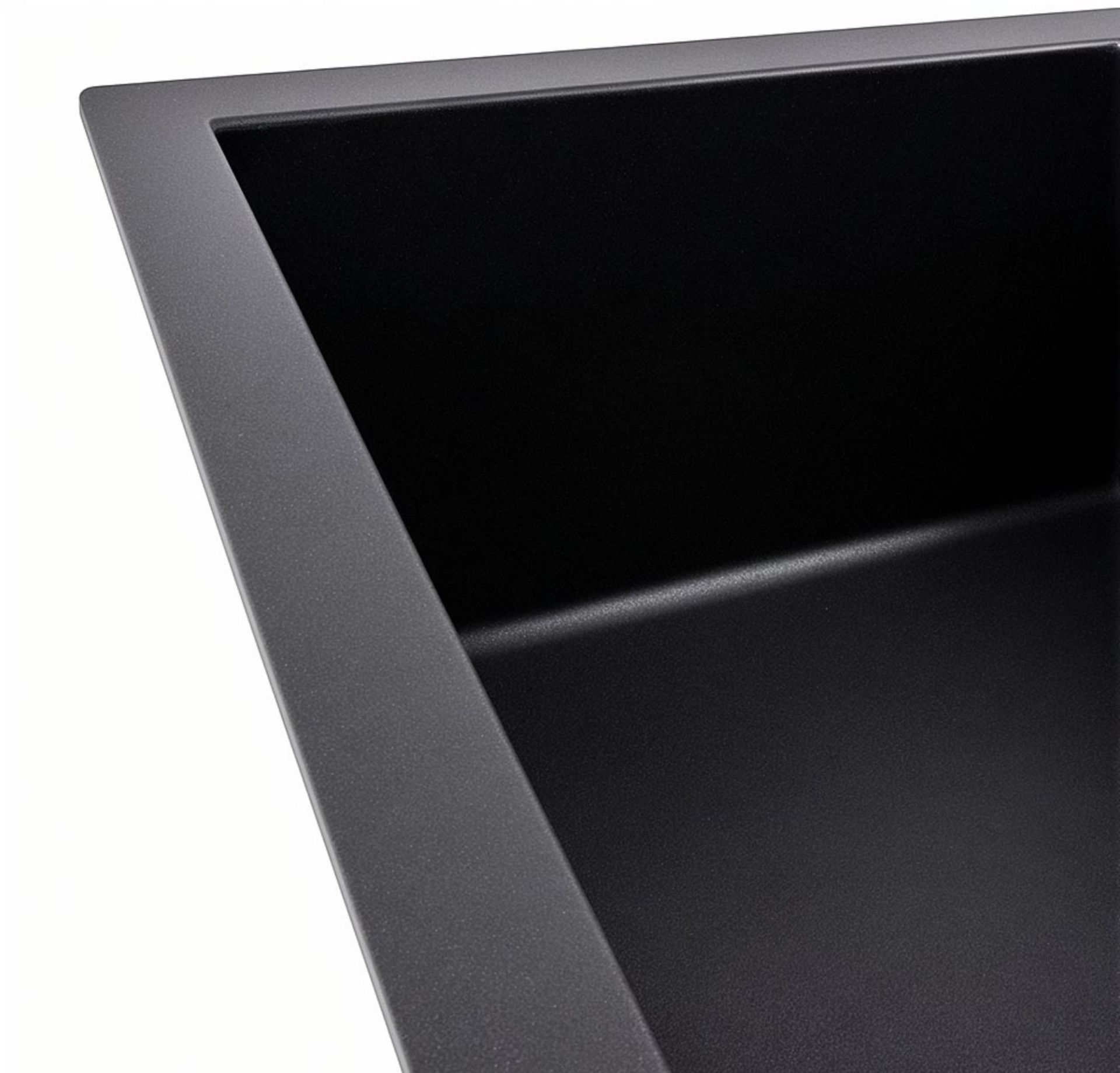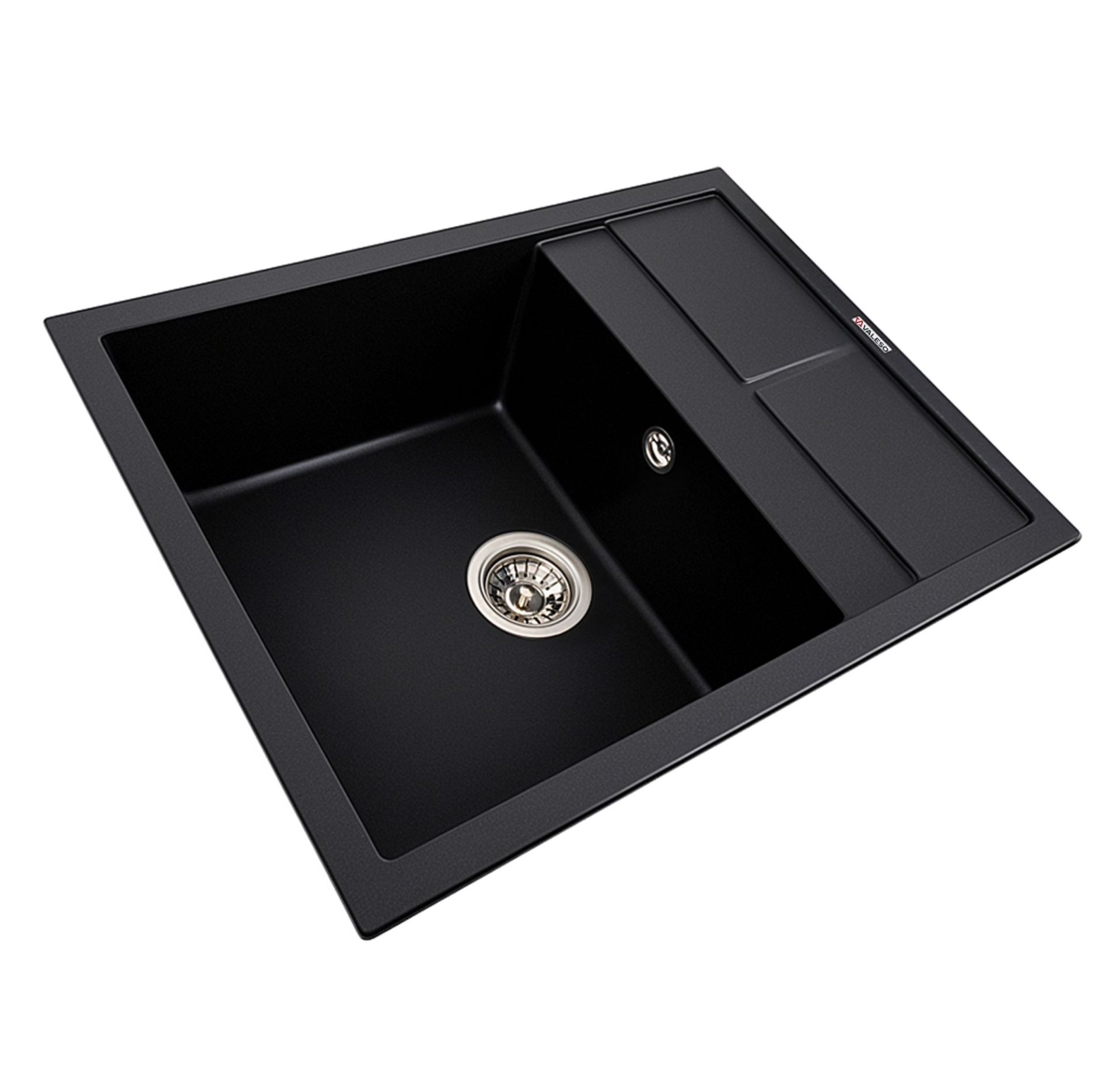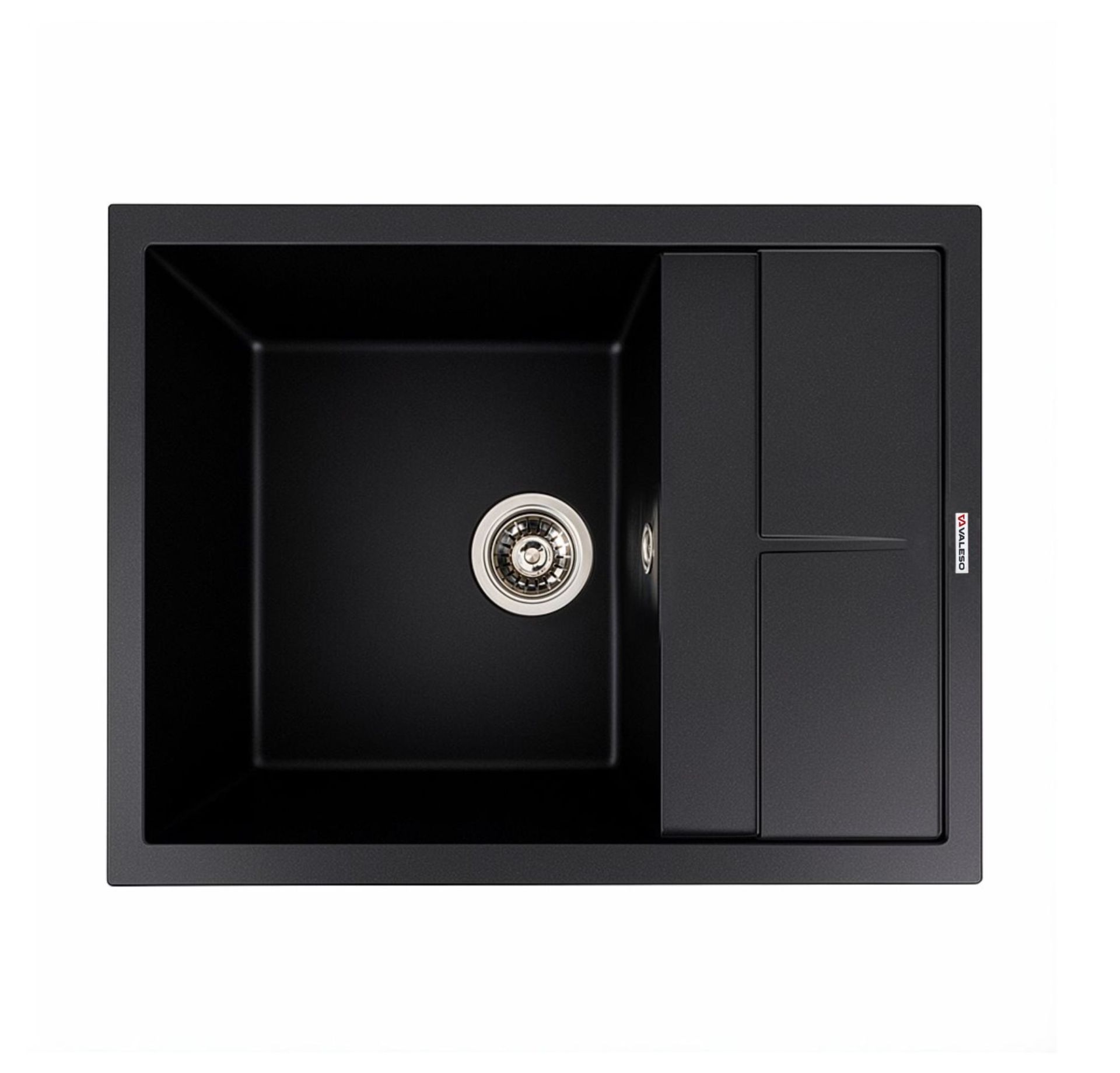 Компактна гранітна мийка VALESO 6550 LOTOS Серцем цього набору є мийка VALESO 6550 LOTOS у глибокому чорному кольорі. Завдяки компактним розмірам (650x500x200 мм) вона ідеально підходить для невеликих кухонь. Виготовлена з 80% кварцового піску та 20% смоли, мийка має приємну на дотик поверхню, що нагадує природний камінь, і стійка до пошкоджень. Зручна чаша (380х435х200 мм) і крило для сушіння роблять її надзвичайно практичною для щоденного використання.