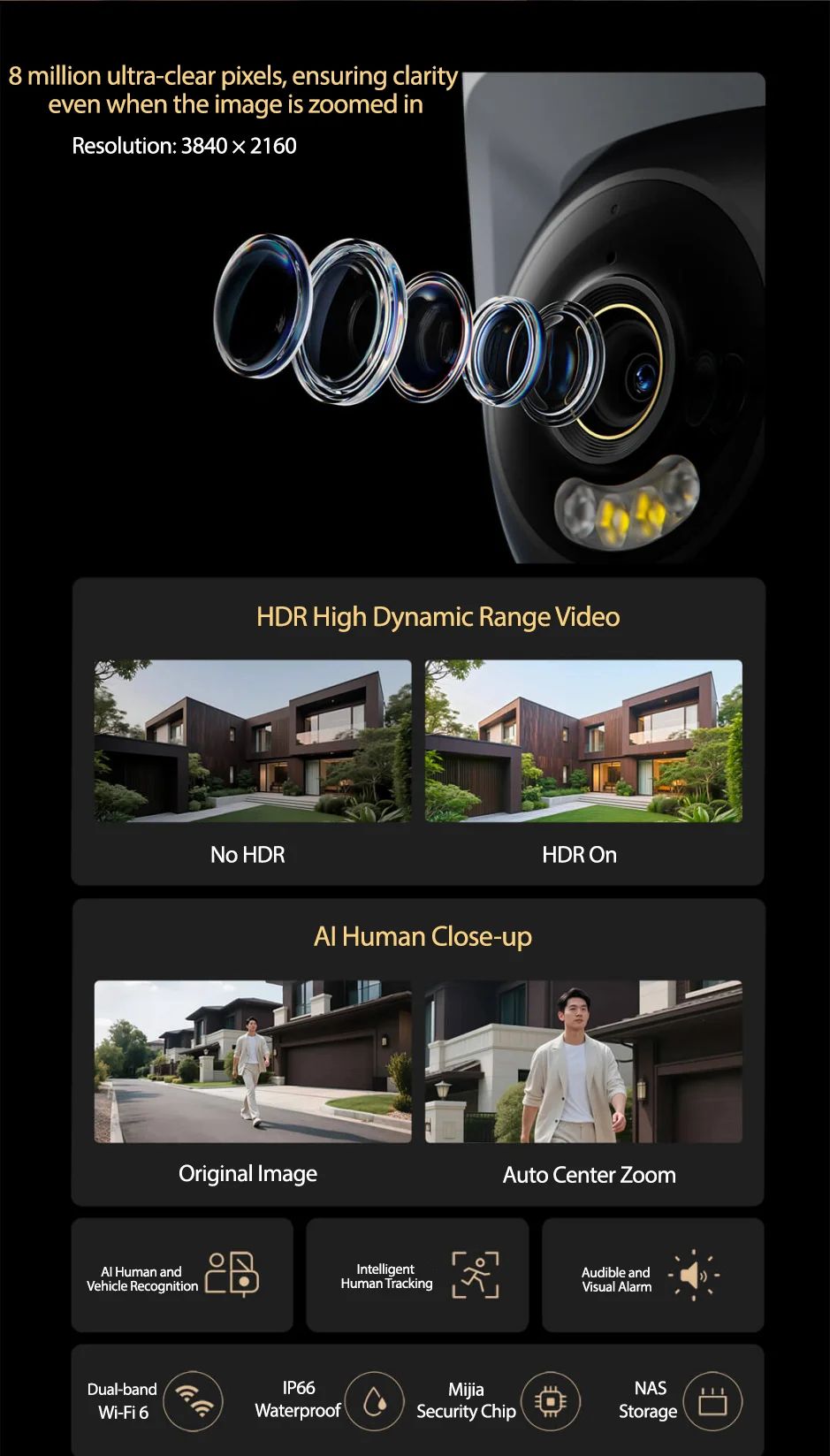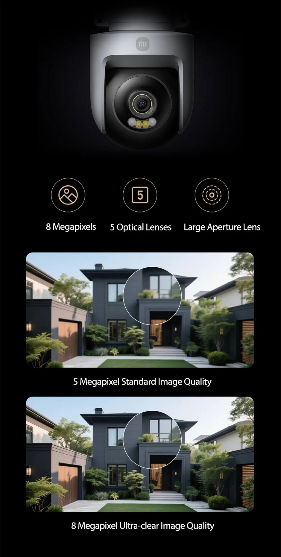 Зовнішня камера Xiaomi 4 Китайська версія !!! Надзвичайно чітке зображення 4K Evolution, чітке навіть у контровому освітленні та тінях *8 МП ультрачіткі пікселі, роздільна здатність 3840×2160 *Високодинамічне відео HDR *Зйомка гуманоїдів крупним планом зі штучним інтелектом *Розпізнавання людей та транспортних засобів зі штучним інтелектом *Інтелектуальне відстеження гуманоїдів *Звукове та візуальне попередження *Дводіапазонний Wi-Fi 6 *Водонепроникність IP66 *Чіп безпеки Mijia [embed]https://youtu.be/VMohW0iXPFU?si=q6Sv9HFRUMapW4PD[/embed] 8 МП, ультрачітка якість зображення 4K, реалістичні деталі Зовнішня камера Xiaomi 4 оснащена професійним 8-мегапіксельний сенсор з роздільною здатністю 3840×2160 забезпечує чітке та витончене зображення 4K. Завдяки великій діафрагмі f/1.6 нічні зображення залишаються яскравими та чіткими. *8 МП *5 оптичних лінз *Лінза з великою діафрагмою Динамічне налаштування HDR, чіткість підсвічування та яскравого світла Режим розширеного динамічного діапазону (HDR) нового покоління може інтелектуально реагувати на складні джерела світла. Він запобігає переекспонуванню при сильному освітленні, зберігає деталі підсвічування та відновлює справжні рівні зображення. Інтелектуальне повнокольорове нічне бачення, подвійні лампові намистини, подвійний захист Об'єктив використовує комбіновану схему заповнюючого світла «подвійні лампи білого світла + подвійні інфрачервоні лампи». Коли вночі виявляється людська фігура, заповнююче світло може автоматично вмикатися, і повнокольорове зображення одразу з'являється з чіткими деталями. Зовсім нове покоління ISP, флагманський чіп штучного інтелекту, стрімка продуктивність Вбудований флагманський чіп штучного інтелекту 1T, який може ефективно покращити продуктивність камери, забезпечуючи швидше виявлення за допомогою штучного інтелекту та точніші обчислення. Процесор сигналу зображення ISP може ефективно зменшити спотворення зображення та покращити відновлення сцени. *Вбудований чіп обчислювальної потужності 1T, 1T = 10¹² операцій за секунду, тобто обчислювальна потужність 1T може досягати 10 000 мільярдів операцій за секунду. *ISP розшифровується як обробка сигналу зображення. Гуманоїд крупним планом: фіксація ключових кадрів, захоплення ключової інформації з першого погляду Після інтелектуальної ідентифікації цілі кадр автоматично збільшується, а невелике вікно одночасно зберігає панорамний вид. Ви можете чітко бачити як далеко, так і поблизу, не пропускаючи важливих кадрів. Штучний інтелект точно ідентифікує транспортні засоби та гуманоїдів, не пропускаючи ключових кадрів Він може інтелектуально визначати динаміку в області, точно розрізняти гуманоїдів та транспортні засоби, а також надсилати нагадування в режимі реального часу про аномальні ситуації. Ключові області чітко видно та швидко реагують, забезпечуючи більш надійний захист. Інтелектуальне відстеження та блокування, легке виявлення рухів цілі Інтелектуальне відстеження на основі штучного інтелекту може автоматично відстежувати та знімати людські фігури після їх виявлення, доки вони не зникнуть з поля зору. Воно завжди блокує ключові динамічні рухи, роблячи зображення моніторингу більш повними та надійними. Звукова та візуальна сигналізація, сильне стримування Коли в зоні моніторингу виявляється аномалія, автоматично спрацьовує звуковий сигна