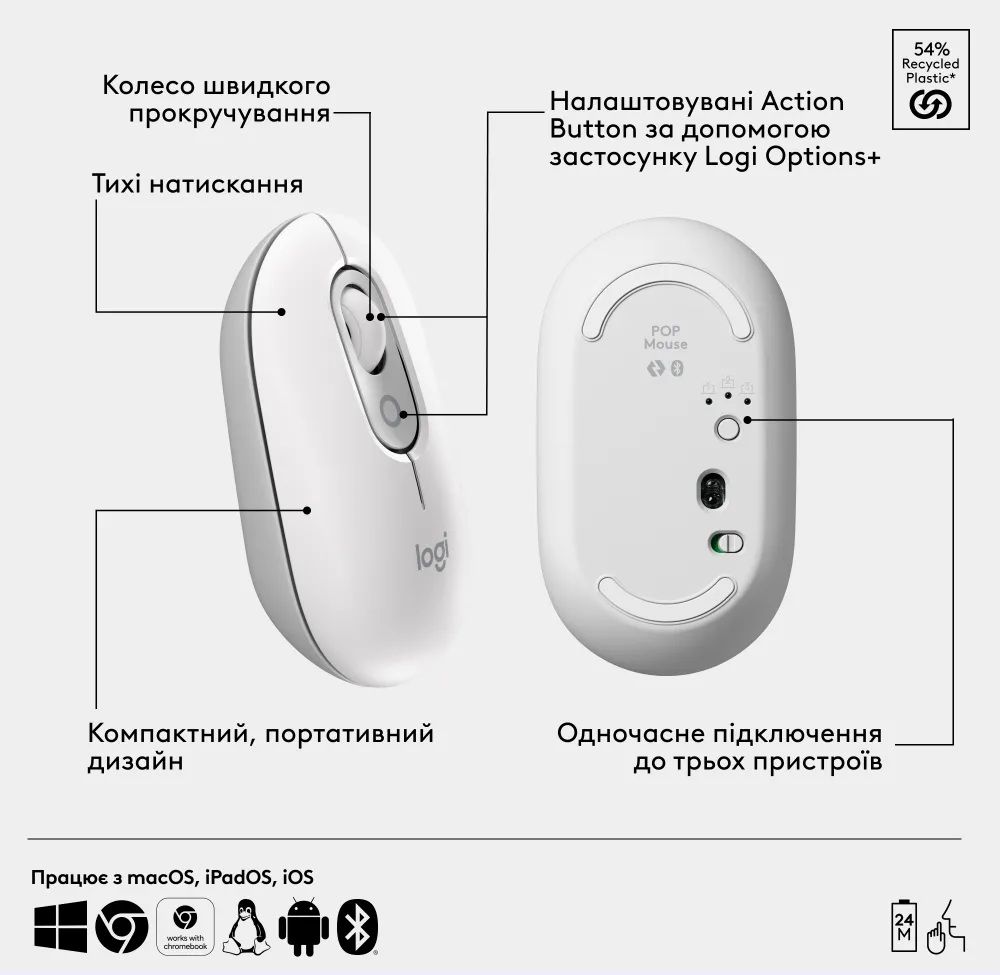 Бездротова миша Logitech POP Mouse, BT, 1xAA, 1000DPI, Off-White (910-007411)