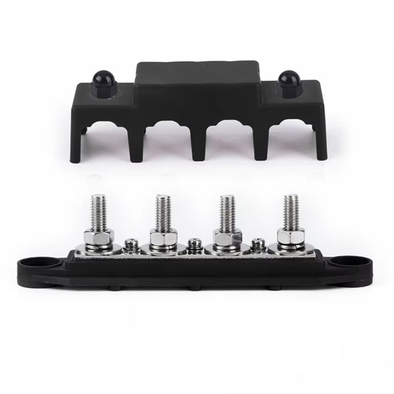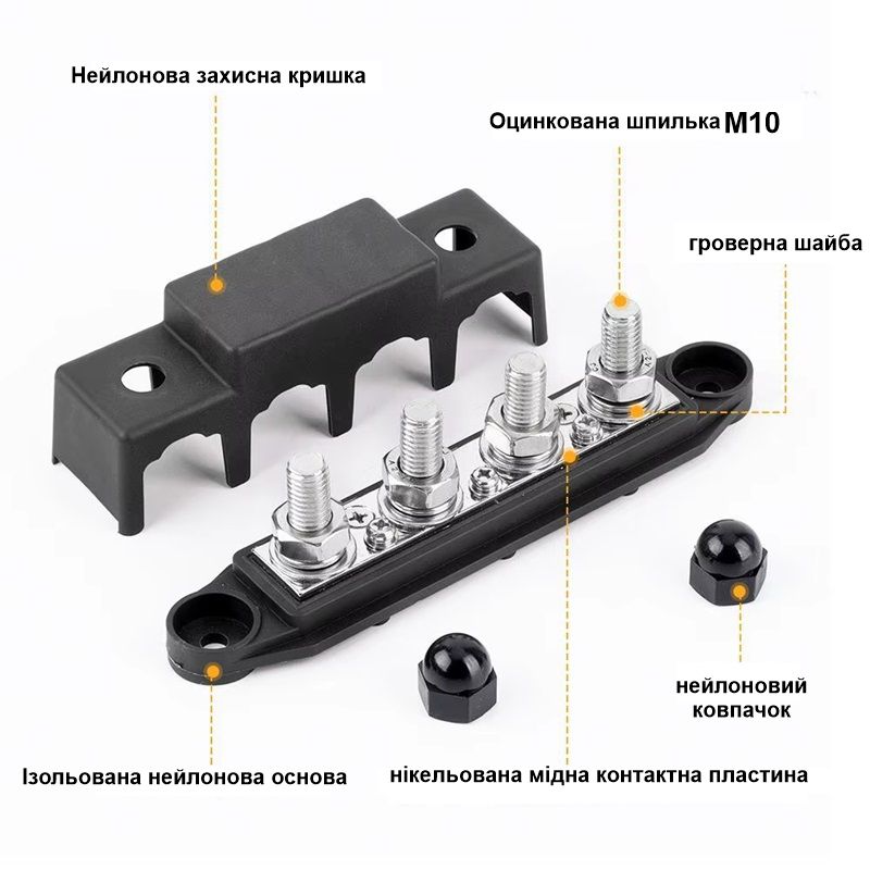 Π ΠΎΠ·ΠΏΠΎΠ΄ΡΠ»ΡΠ½ΠΈΠΉ Π±Π»ΠΎΠΊ Π· ΡΠΈΠ½ΠΎΡ Bus Bar Π· 4-ΠΌΠ° ΡΠΏΠΈΠ»ΡΠΊΠ°ΠΌΠΈ Π10 Π΄Π»Ρ Π·'ΡΠ΄Π½Π°Π½Π½Ρ ΠΊΠ°Π±Π΅Π»ΡΠ² 12-48V DC, Π΄ΠΎ 250A (ΡΠΎΡΠ½ΠΈΠΉ)