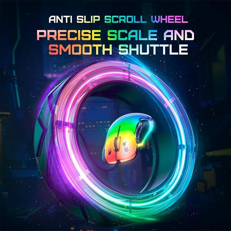 - Корпус із прозорого пластику з динамічним RGB-підсвічуванням створює футуристичний вигляд. Підсвічування змінює колір залежно від вибраного рівня DPI, що не тільки ефектно виглядає, але й допомагає контролювати налаштування під час гри.