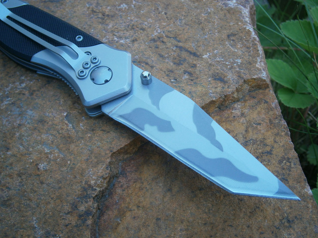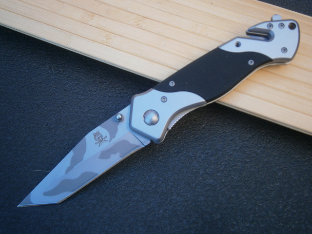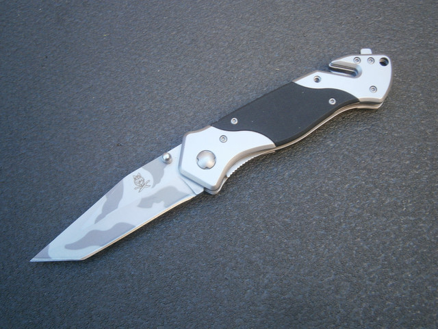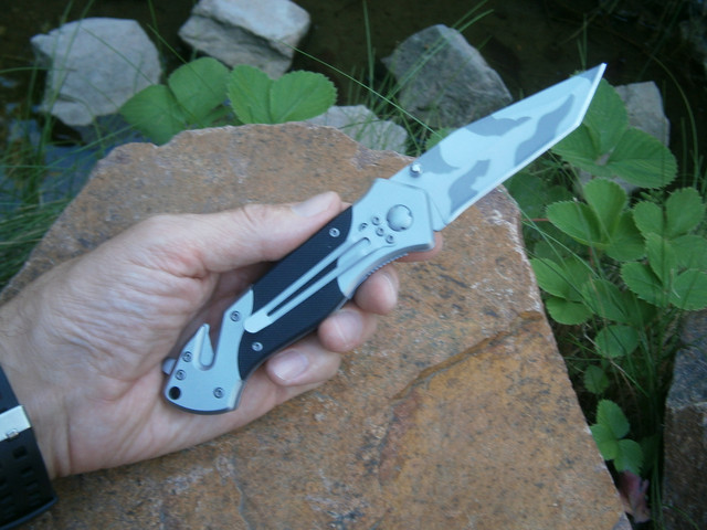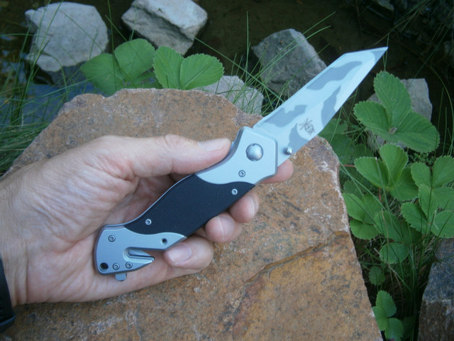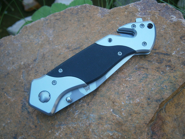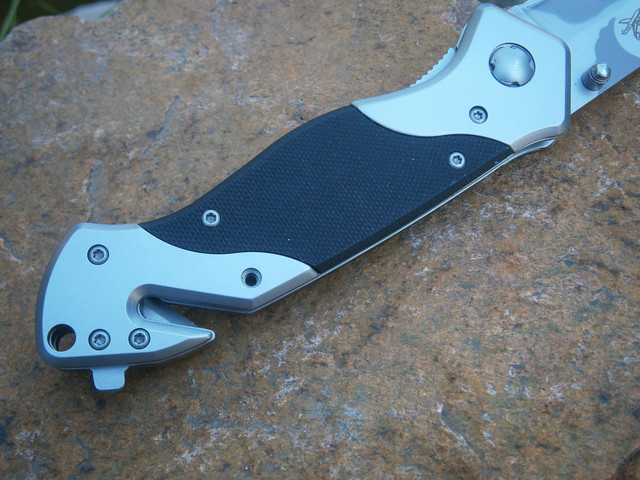 Ручка ножа виконана із металу з накладками із G-10, що робить її міцною і стабільною. Рукоять оснащена стропорізом, склобоєм і кліпсою для кріплення ножа на ремені, рюкзаку, або системі "моллі ".