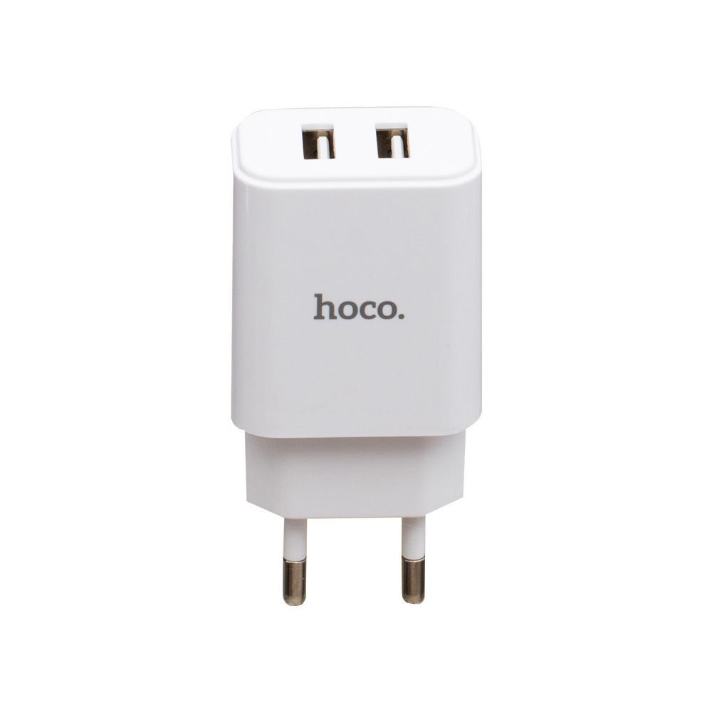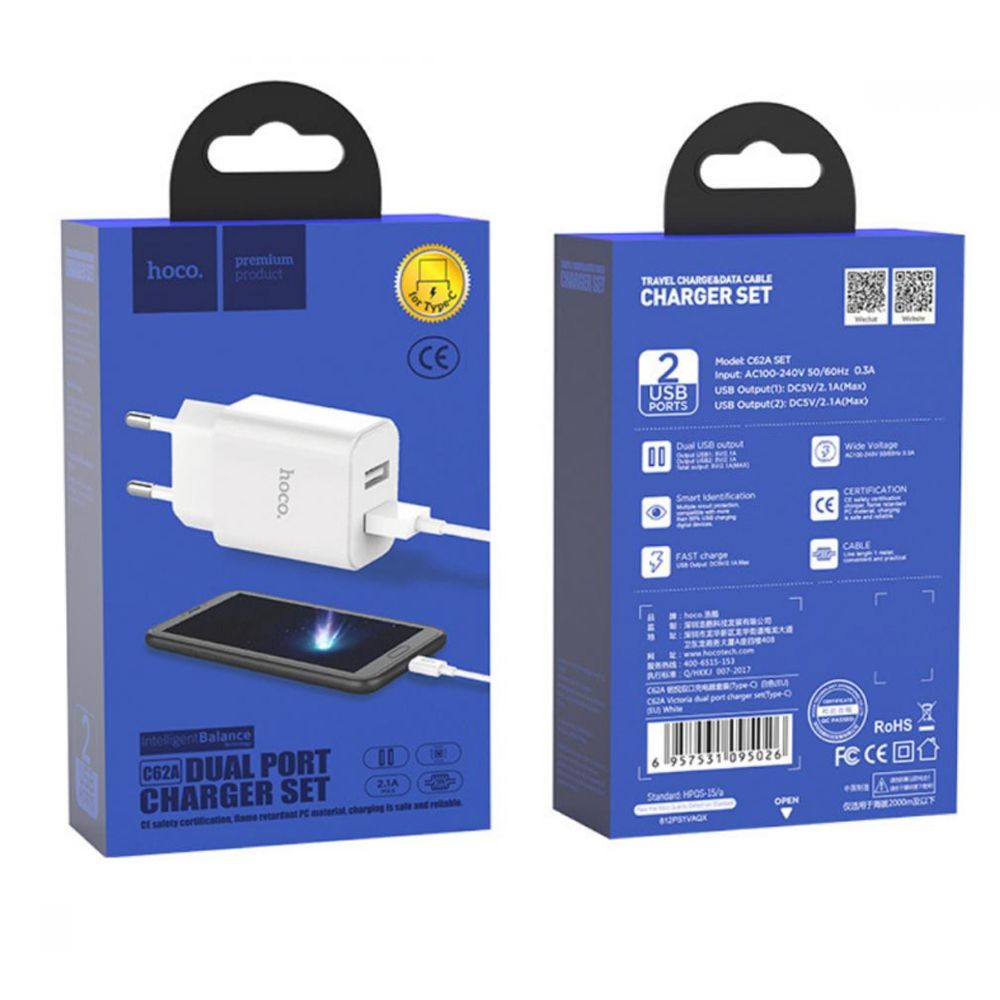 Мережевий зарядний пристрій Hoco C62A Victoria, кабель Type-C, 2USB, 2.1A, White