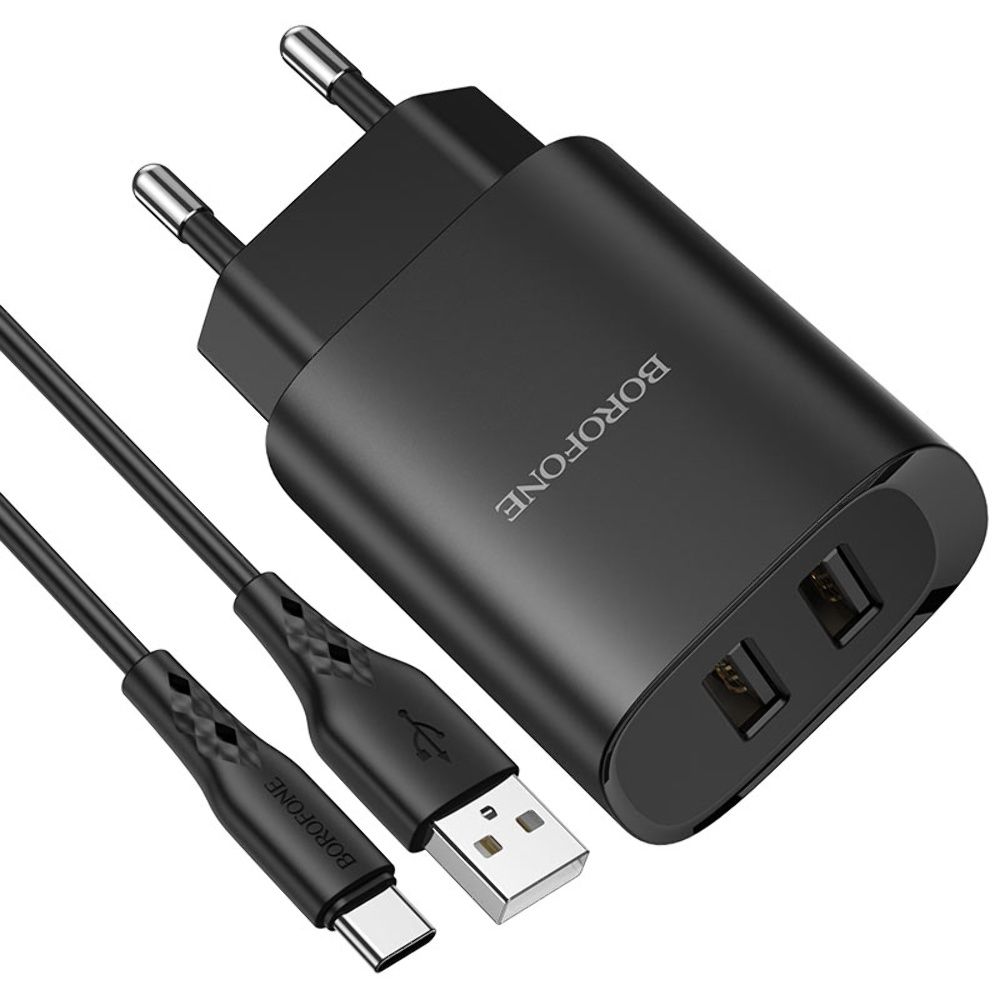 Мережевий зарядний пристрій Borofone BN2, 2 USB, чорний, кабель USB to Type-C