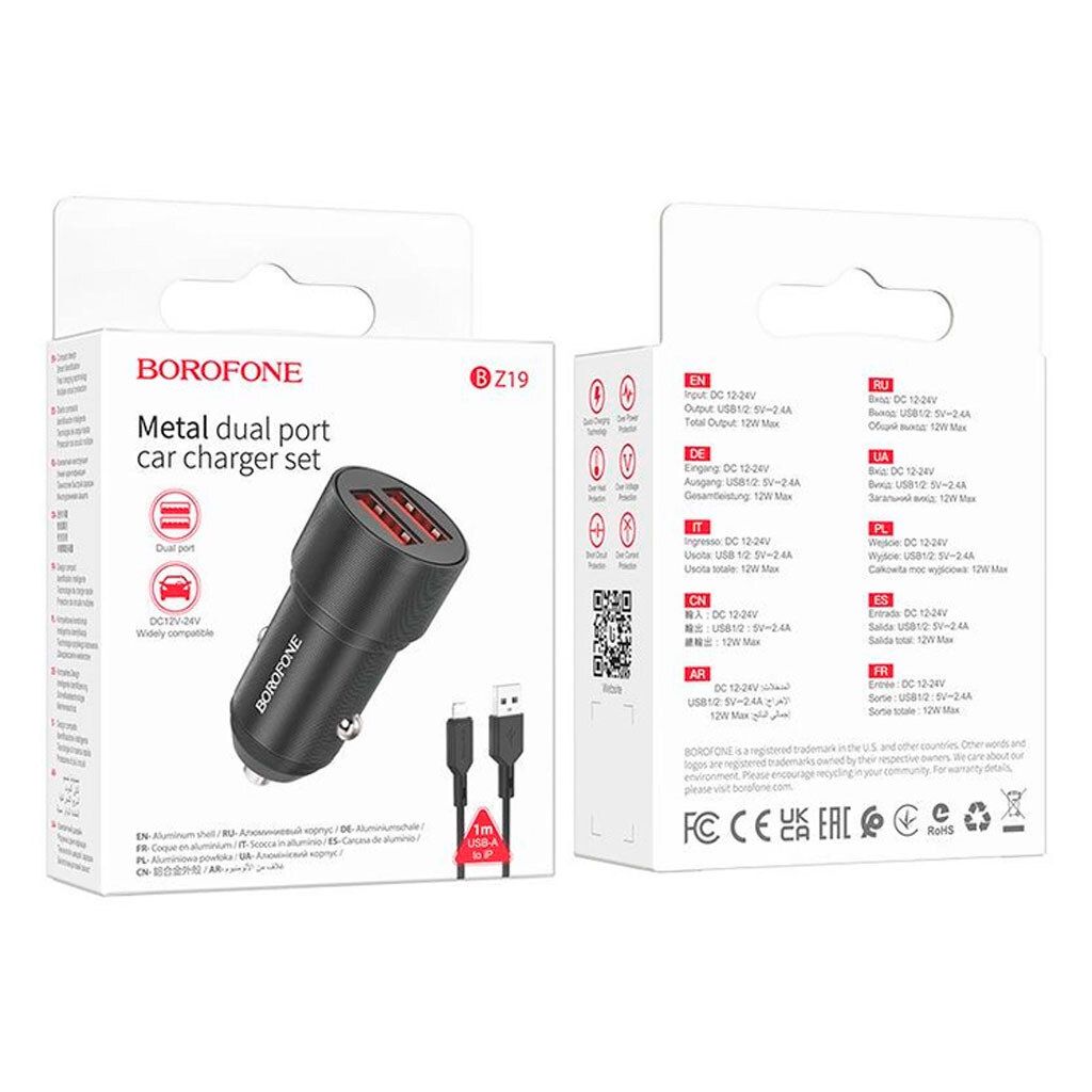 Автомобільний зарядний пристрій Borofone BZ19 Wisdom, кабель USB to Lightning, 2.4A, Чорний
