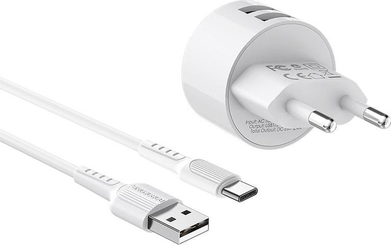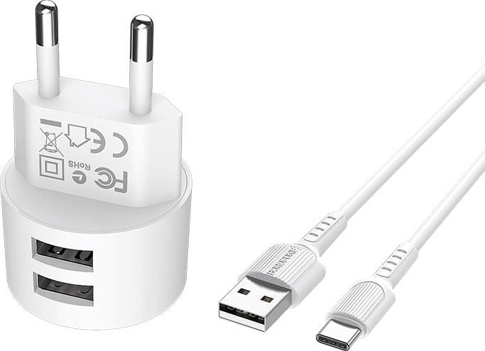 Мережевий зарядний пристрій Borofone BA23A, 2 USB, 2.4А, білий, кабель USB to Type-C