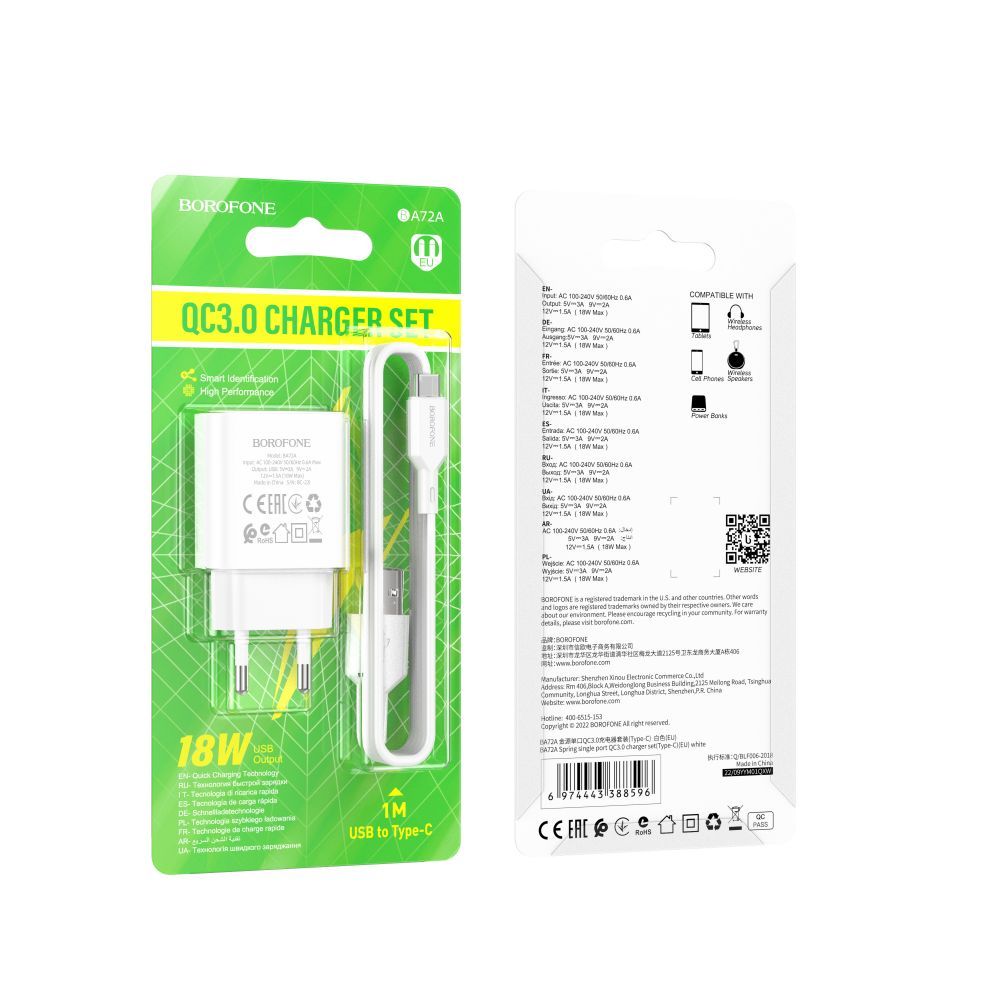 Мережевий зарядний пристрій Borofone BA72A Spring, QC3.0, кабель USB to Type-C, Білий