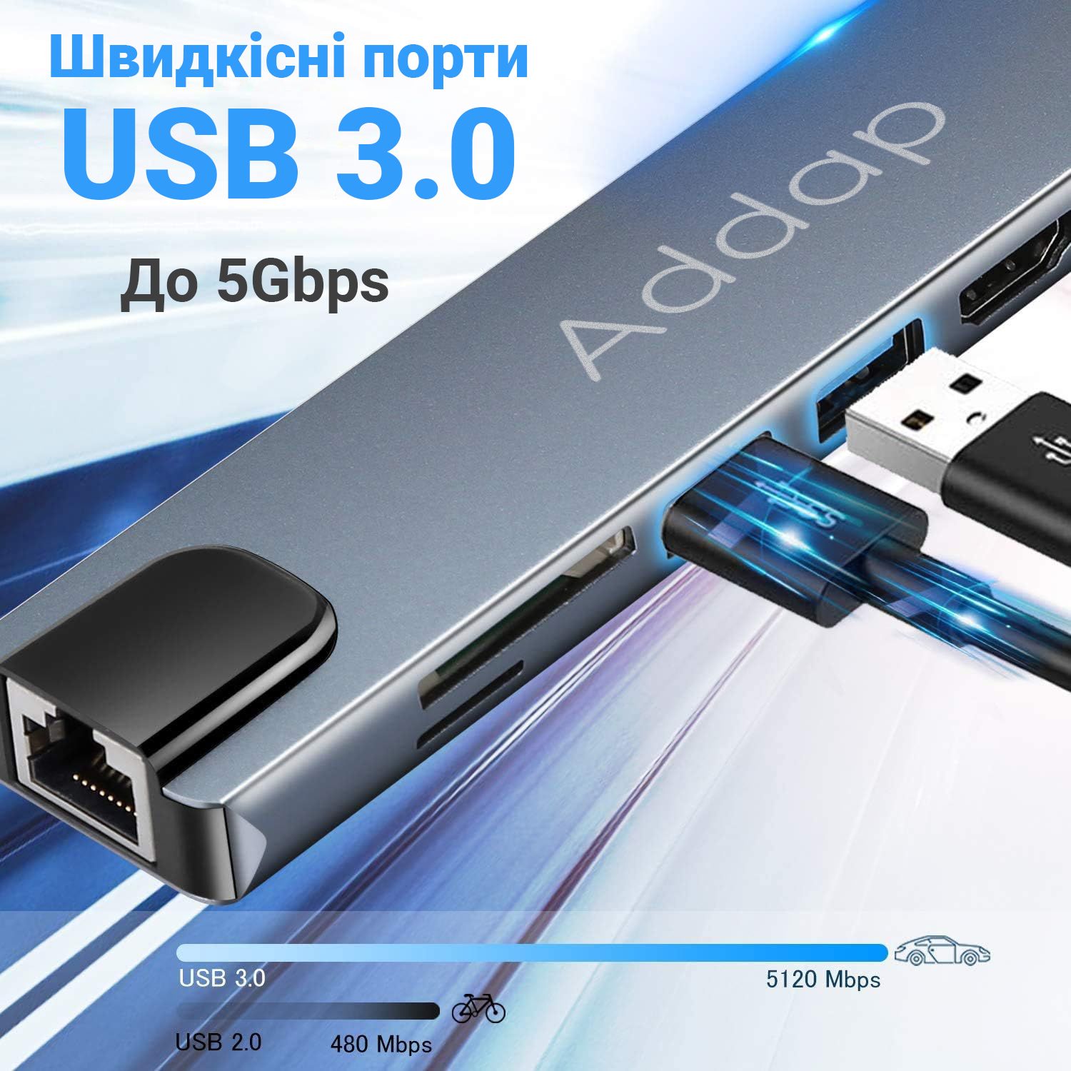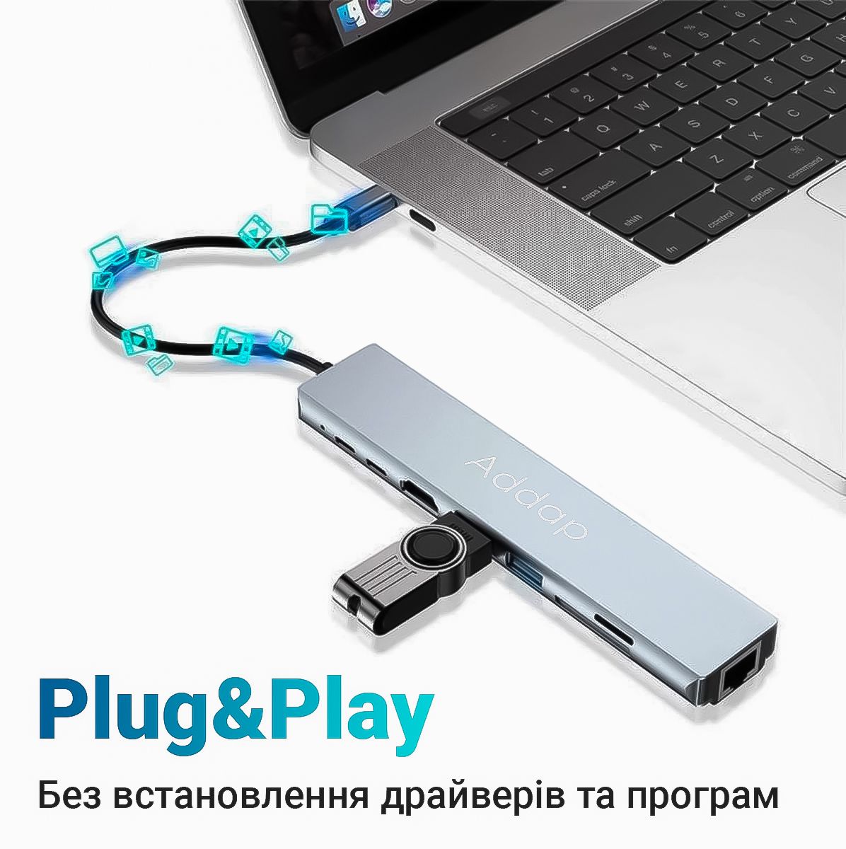 УЦІНКА!!! Мультифункціональний USB Type-C хаб Addap MH-04, 8 в 1: PD + USB C + SD + TF + RJ45 (некоректно працює HDMI порт)