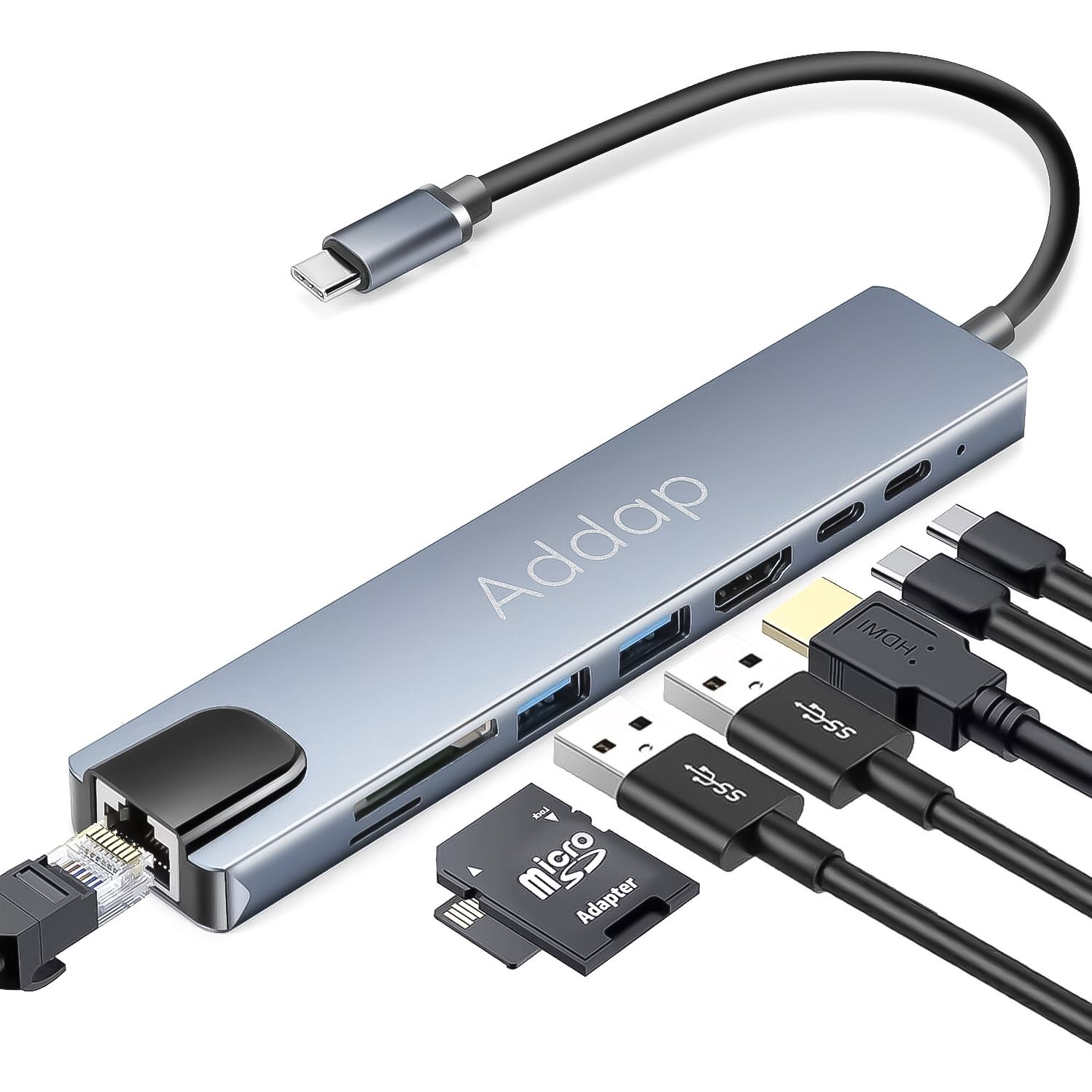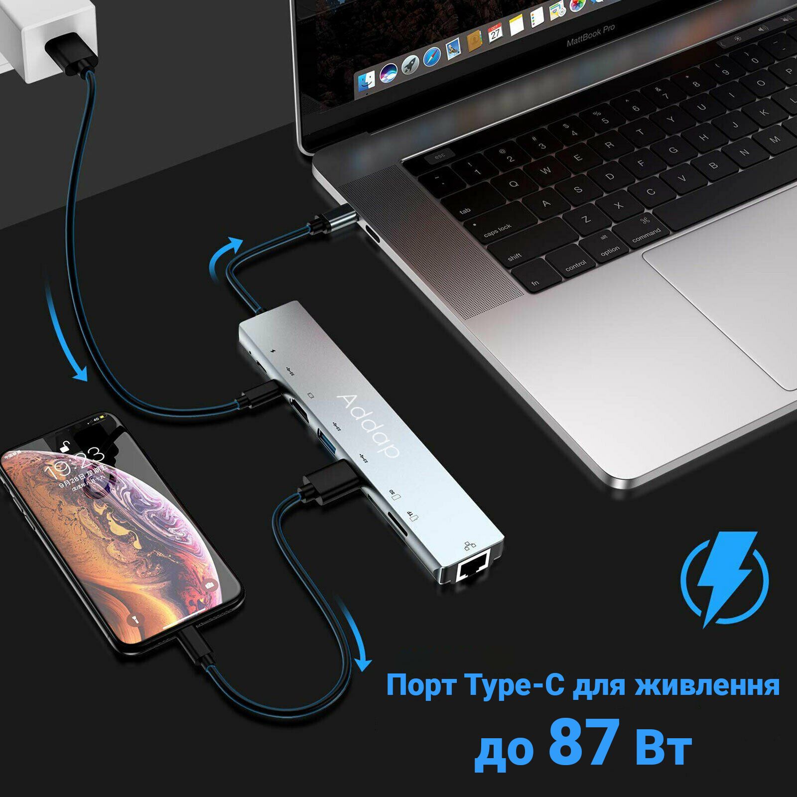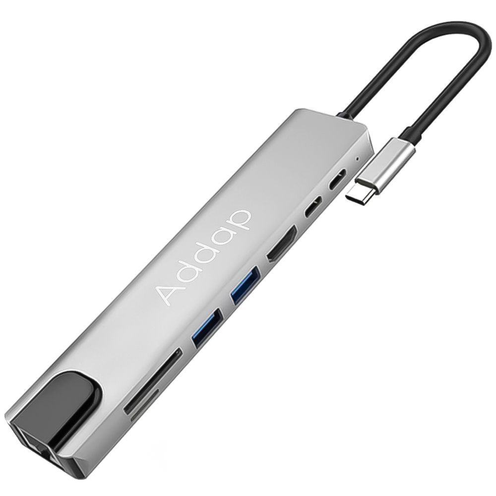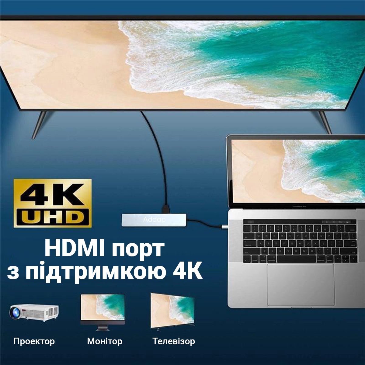 Мультифункціональний USB Type-C хаб Addap MH-04, 8 в 1: HDMI / HDTV + PD + USB C + SD + TF + RJ45