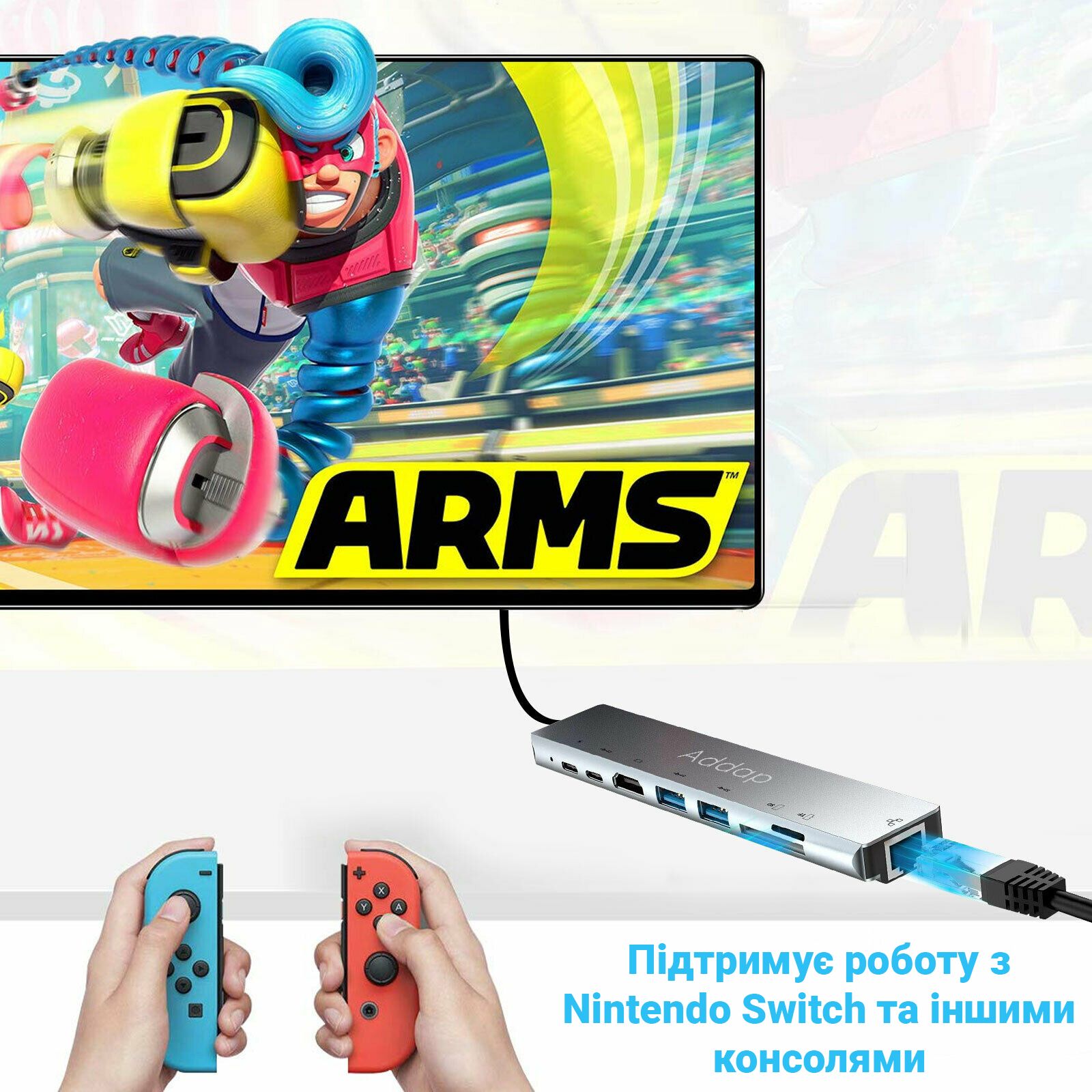 - 8 в 1: можливість підключення до одного порту USB Type-C 8 різних пристроїв