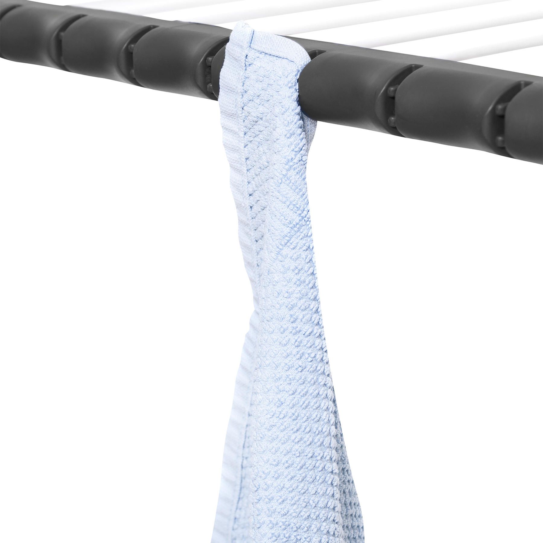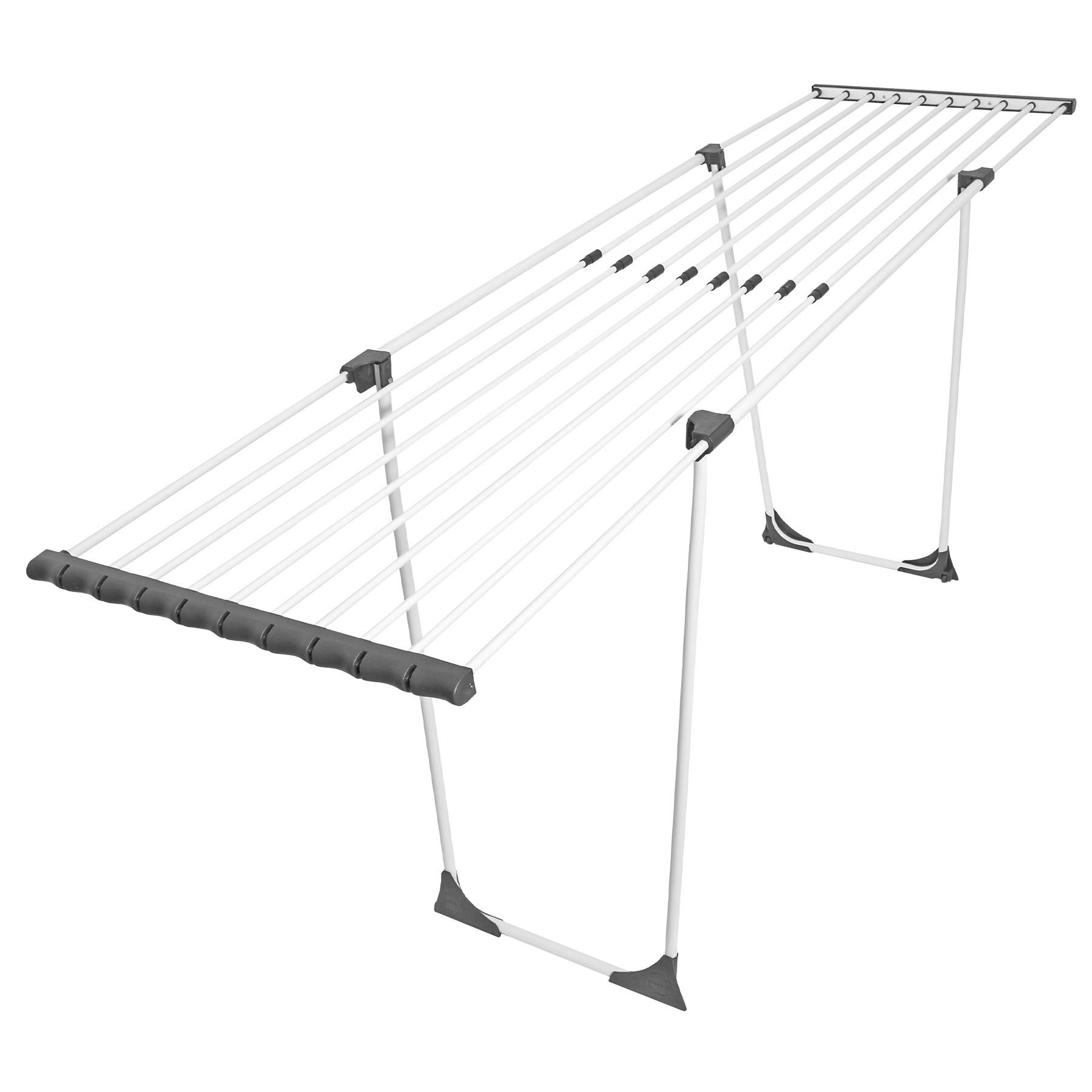 Сушарка оснащена двома опорними ніжками з коліщатками, які дозволяють легко переміщати її навіть у завантаженому стані, не пошкоджуючи підлогу. Пластикові ніжки забезпечують додаткову стабільність, а бічні панелі — зручне місце для сушіння дрібних речей, таких як шкарпетки чи дитячий одяг.