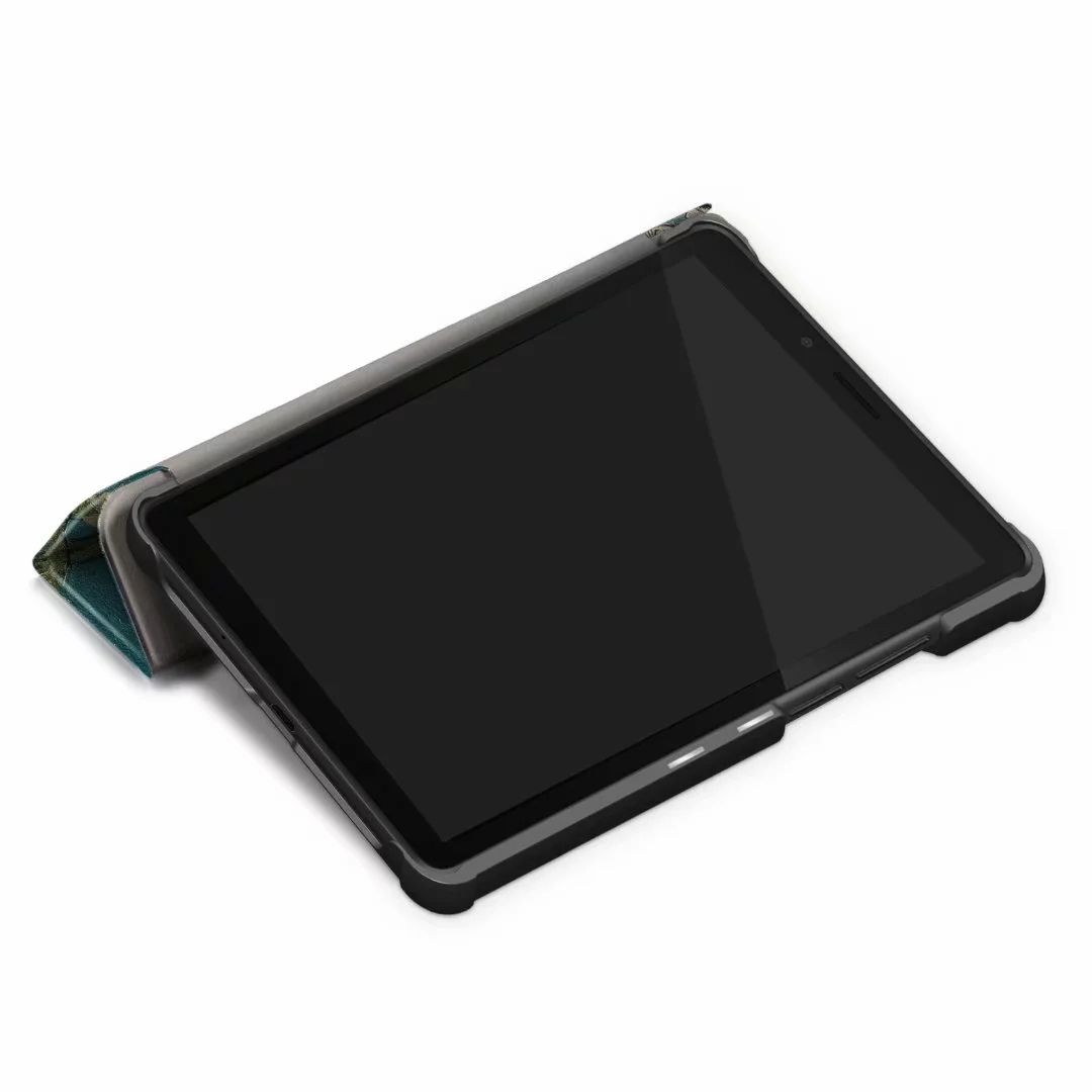 Чохол Lenovo Tab M8 TB 8505X зовні обклеєний шкірою пересованої виглядає дуже стильно, а завдяки своїй структурі чітко повторює форму планшета. Пластикова основа чохла, яка засувається на задню частину планшета, зроблена з міцного, але в той же час не товстого пластику. Для того щоб ваш планшет менше піддавався дрібним пошкодженням зсередини пластик обклеєний мікрофіброю, яка плавно переходить в обкладинку, яка закриває екран. Зовнішній матеріал також цілісним шматком переходить із задньої кришки на передню частину яка закриває екран. Природно зроблений він виключно для Lenovo Tab M8, так що всі камери, регулятори, кнопки і отвори будуть легко доступні. Конструкція чохла дозволяє без особливих зусиль перетворити його на підставку, що дуже зручно, коли ви втомилися і хочете просто подивитися фільм. Ви просто складаєте пробігану передню обкладинку по згинах і ви отримуєте трикутну підніжку Lenovo Tab M8 TB 8505X, а за рахунок вшитих всередину магнітів вона в такому стані тримається дуже міцно. А на додаток до цього є ще одна дуже зручна функція - при закритті чохла екран гасне завдяки спеціальним внутрішнім магнітам.