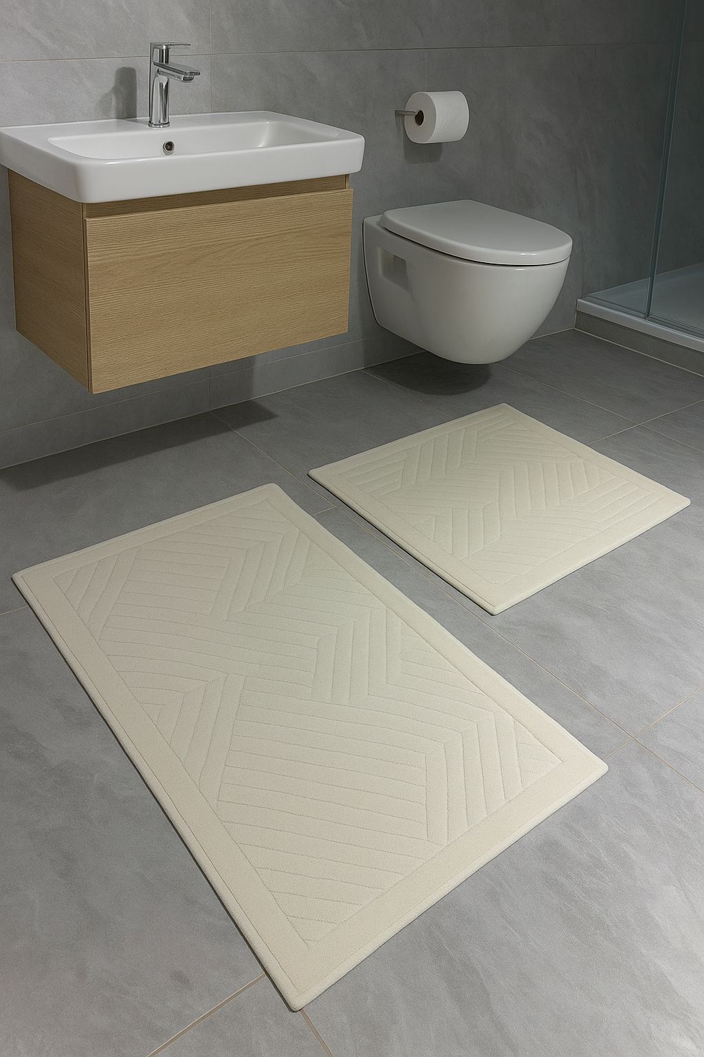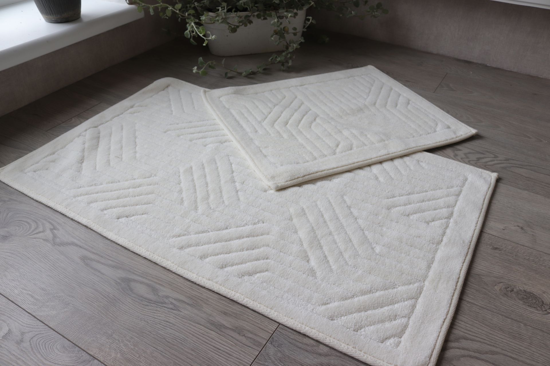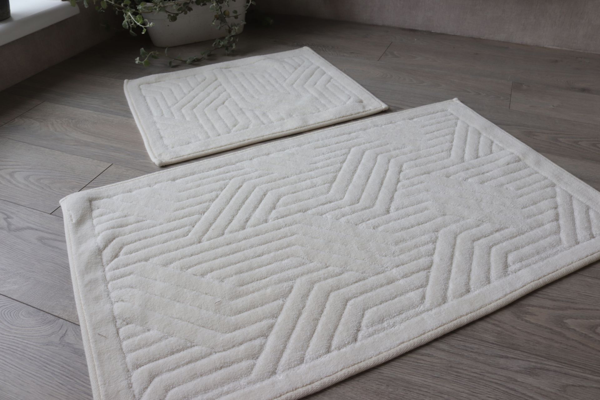 Килимки виготовлені зі 100% бавовни, приємні на дотик і добре вбирають вологу. Завдяки двом розмірам (100×60 см і 50×60 см) набір підходить для розміщення біля ванни, умивальника чи унітазу.