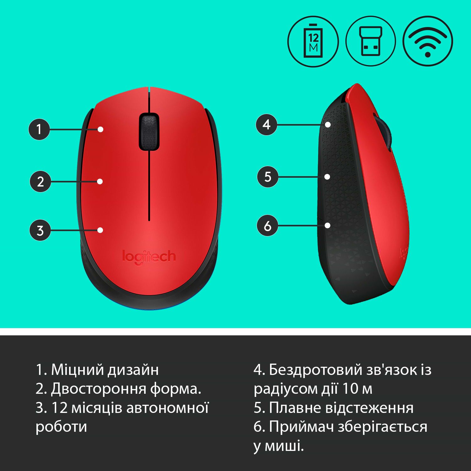 - Ця миша створена за високими стандартами, які зробили Logitech світовим лідером у виробництві комп'ютерних аксесуарів.
