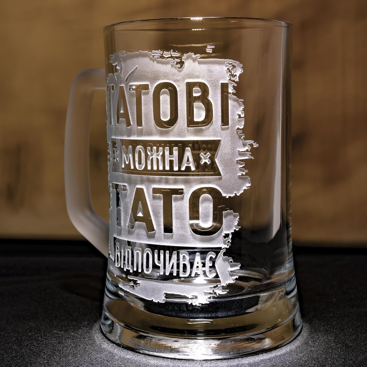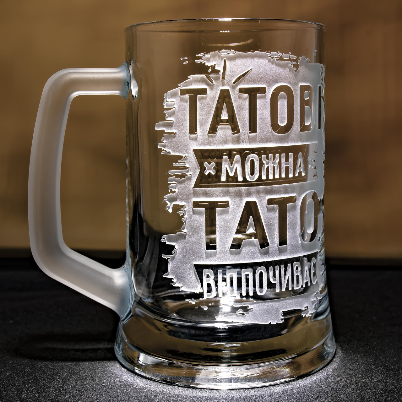 Сувенірний бокал для пива з ручним глибоким механічним гравіюванням напису Татові можна, Тато відпочиває у подарунковій коробці