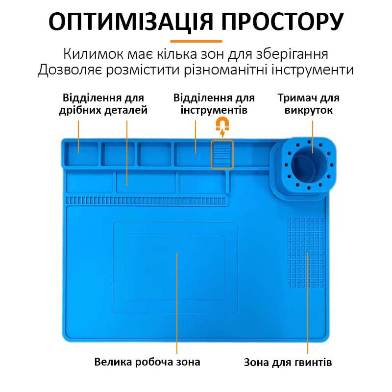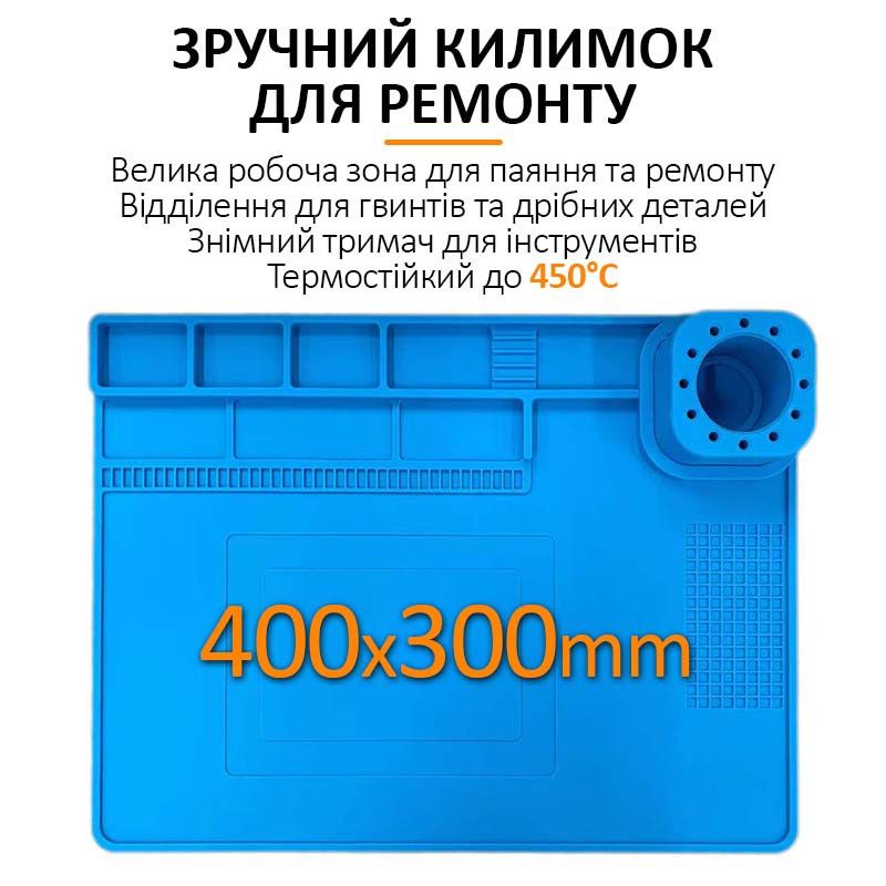 Цей килимок забезпечує безпеку, порядок та довговічність вашого робочого місця, а його ергономічний дизайн робить процес паяння максимально комфортним та акуратним.