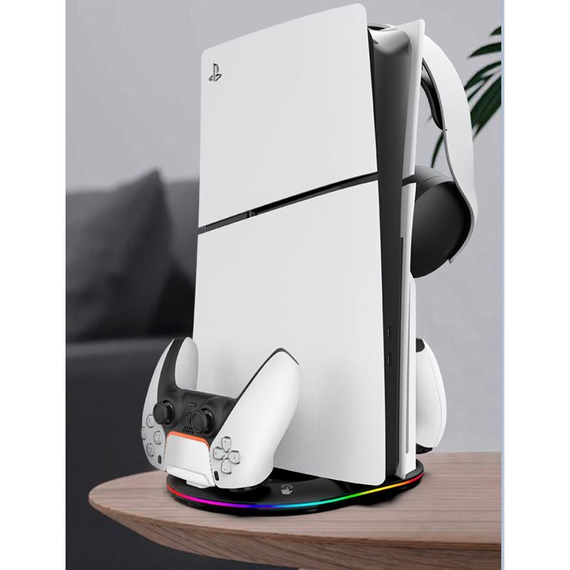 - Не вимагає додаткових драйверів або складних налаштувань — просто підключіть док-станцію до консолі через USB, встановіть PS5 Slim і розмістіть контролери на зарядних слотах. Усі функції активуються автоматично.