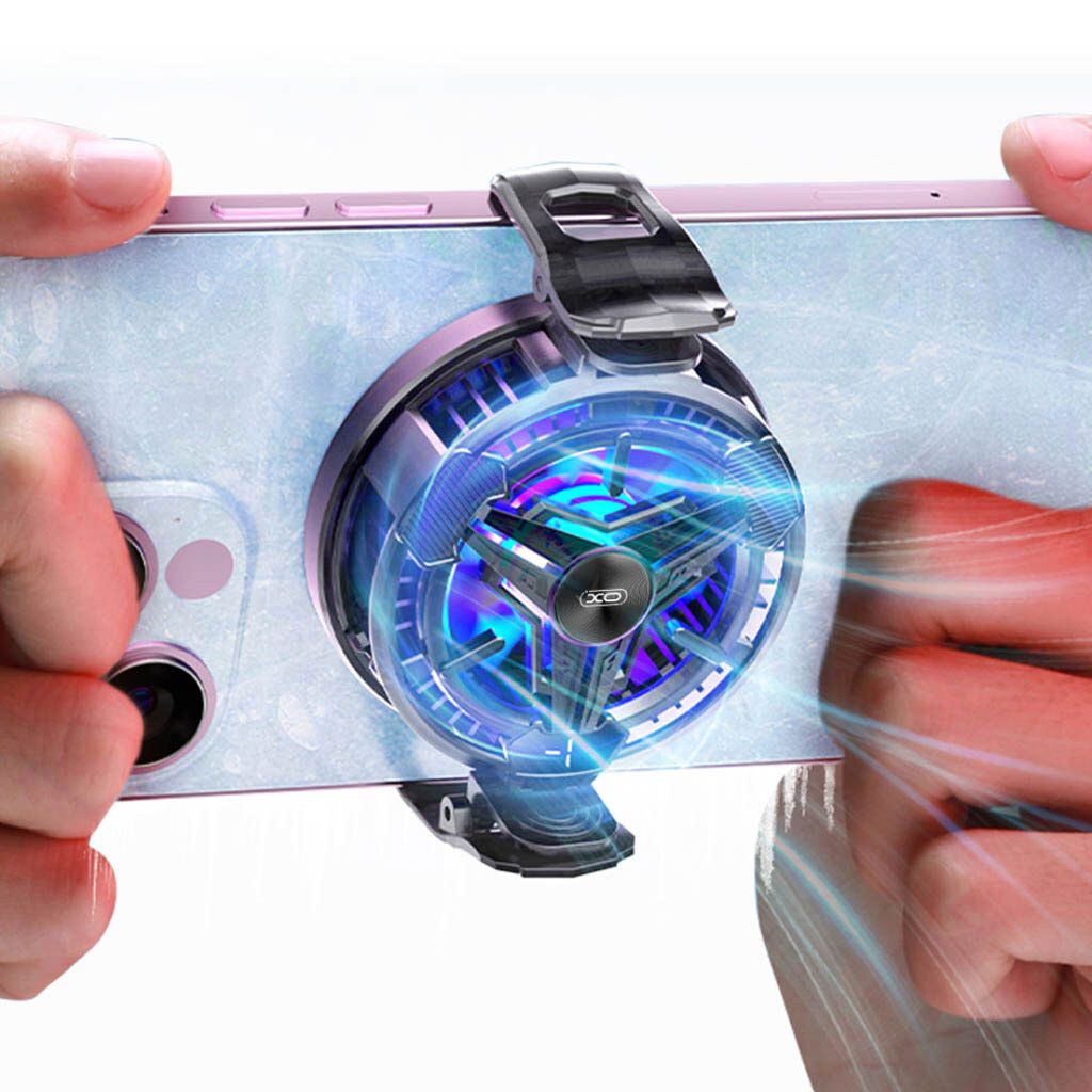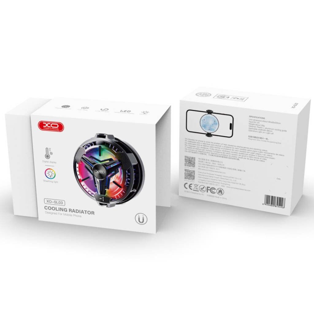 - XO SL03 оснащений алюмінієвим радіатором та потужним вентилятором, які створюють спрямований потік повітря, швидко відводячи тепло від задньої панелі смартфона. Температура пристрою може знижуватися до 0°C, що запобігає перегріву та забезпечує стабільну роботу при тривалих навантаженнях.