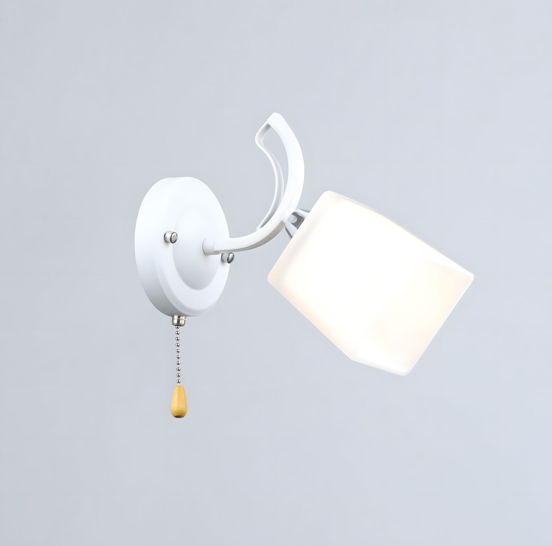 Каркас виготовлений з міцного металу білого та хромового кольору, скляним плафоном та мотузкою за домогою якою ви можете вмикати бра, що підкреслює сучасний дизайн.