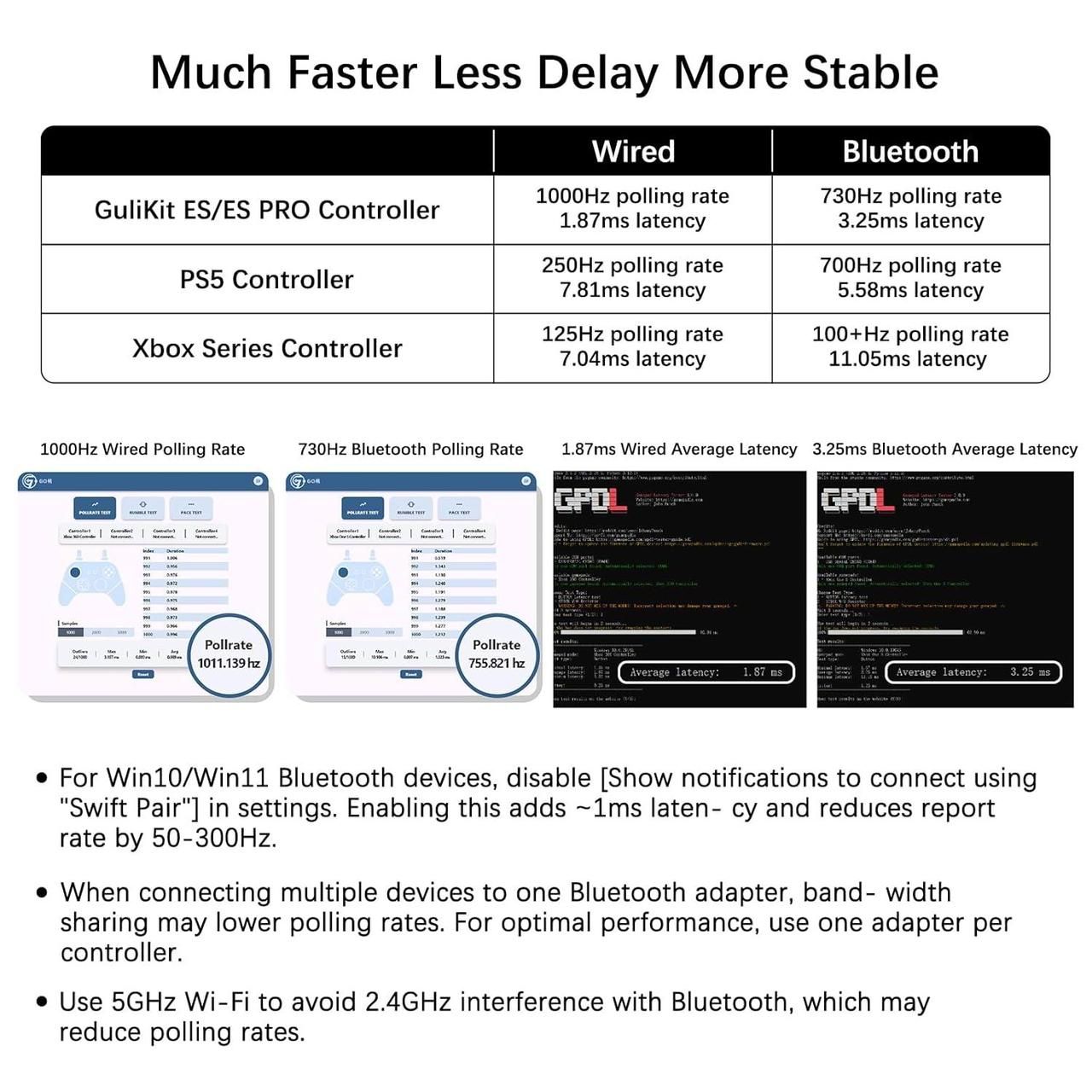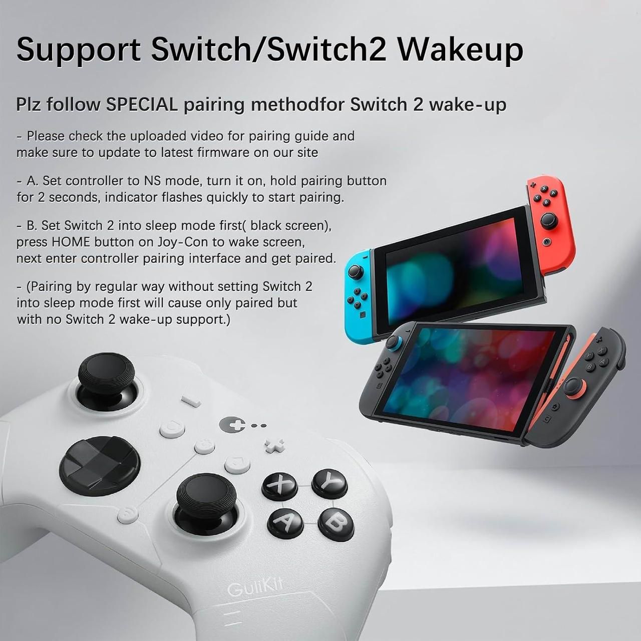 Надшвидкісний бездротовий та дротовий геймінг Відчуйте конкурентну перевагу завдяки технології GuliKit Hyperlink 2.0. Отримайте блискавично швидке з’єднання Bluetooth (затримка 3,25 мс / 730 Гц) на ПК та майже миттєвий дротовий відгук (1,87 мс / 1000 Гц). Підвищте рівень ігрового процесу завдяки точності рівня кіберспорту. Безперебійне пробудження Switch 2 та Switch 1 Легко виводьте свою консоль Switch 1 або Switch 2 з режиму сну за допомогою цього контролера. (Потрібне просте сполучення — див. відеоінструкцію та перевірте останню версію прошивки). Універсальна сумісність Грайте на ПК (Windows), Switch 2, Switch/Switch Lite/Switch OLED, Android, iOS, macOS, Steam Deck та ROG Ally/X. Миттєво перемикайте пристрої однією кнопкою. Ваш найкращий багатоплатформний контролер. Точні магнітні джойстики на ефекті Холла Вдосконалені електромагнітні джойстики Холла забезпечують неперевершену точність на рівні 2200 та виняткову довговічність. Крім того, тригери на ефекті Холла з 256 рівнями для чудового аналогового керування. 30-годинний час роботи від батареї та автоматичний перехід у режим сну Насолоджуйтесь тривалими ігровими сесіями завдяки акумулятору ємністю 950 мАг (до 30 годин). Функції швидкої зарядки та інтелектуального автоматичного переходу в режим сну після 15 хвилин бездіяльності для економії енергії. Налаштування та покращене керування: налаштуйте свій досвід: налаштуйте чутливість джойстика, інтенсивність вібрації, встановіть турбо-функції, налаштуйте мертві зони. Налаштуйте за допомогою контролера або веб-інструменту GuliKit.