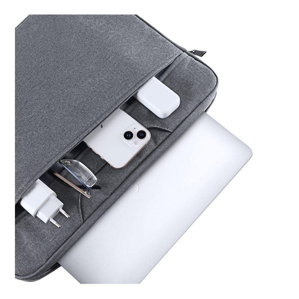- Горизонтальна конструкція із закругленими кутами та зручними ручками робить сумку практичною та комфортною при перенесенні. Товщина корпусу всього 3 см, що дозволяє легко поміщати її в рюкзак або валізу, зберігаючи при цьому достатню місткість для ноутбука та аксесуарів.