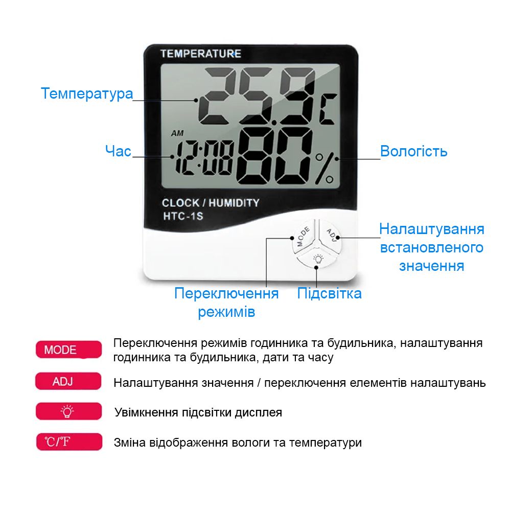 Електронний кімнатний термометр - гігрометр з годинником Uchef HTC-1s, з підсвіткою дисплея, Чорний