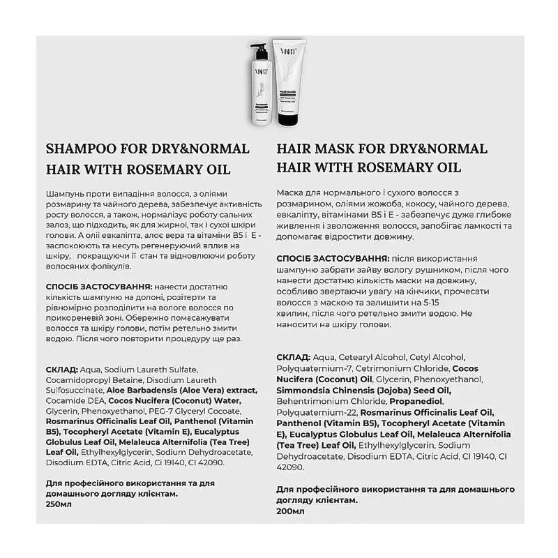 Маска VIART Hair Mask with Rosemary Oil забезпечує інтенсивне живлення та зволоження волосся, попереджаючи ламкість. В основі активної формули засобу містяться олії кокосу, жожоба, розмарину, евкаліпту та чайного дерева. Маска підходить для нормального та сухого волосся.