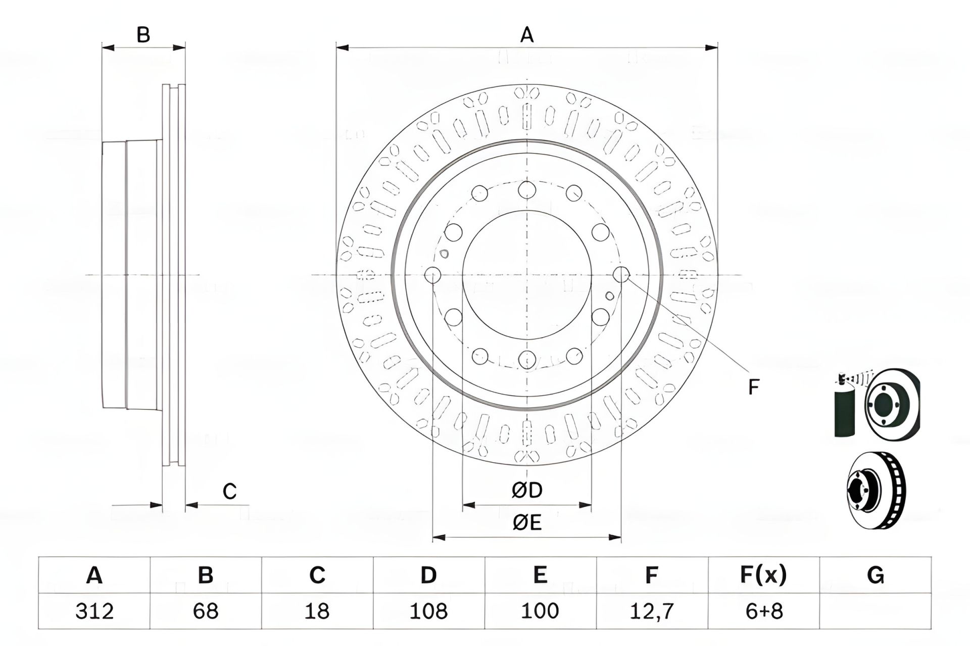 Тип гальмівного диска: вентильований Кількість отворів: 6 Фаска Ø [мм]: 139,7 Діаметр центрування [мм]: 108 відповідає стандартам ECE: ECE-R90 Поверхня: з покриттям Діаметр отвору до [мм]: 14,5 Товщина гальмівного диска (мм): 18 Мінімальна товщина [мм]: 16 Висота [мм] : 68 Зовнішній діаметр [мм] : 312 LEXUS 424310K230 4243160311 TOYOTA 424310K230 4243160311 TOYOTA LAND CRUISER PRADO (_J15_) 2.8 D-4D (GDJ155, GDJ150) | закритий всюдихід | Дизель 1ГД-ФТВ | 150 кВт | 204 к.с. | 07.2020-. TOYOTA LAND CRUISER VAN (_J15_) 3.0 D4d 4WD (KDJ155, KDJ150) | RV/SUV Закрито | Дизель 1КД-ФТВ | 140 кВт | 190 к.с. | 01.2011-. TOYOTA LAND CRUISER PRADO (_J15_) 3.5 (GRJ152_) | закритий всюдихід | |бензин 7ГР-ФКС | 206 кВт | 280 к.с. | 09.2015-. TOYOTA FJ CRUISER (GSJ1_) 4.0 4WD (GSJ15) | позашляховик | бензин 1ГР-ФЕ | 176 кВт | 239 к.с. | 06.2005-12.2009 TOYOTA LAND CRUISER PRADO (_J15_) 3.0 D (LJ150_) | закритий всюдихід | Дизель 5L-E | 70 кВт | 95 к.с. | 07.2009-. TOYOTA FORTUNER (_N15_, _N16_) 4.0 4x4 (GGN155_) | позашляховик