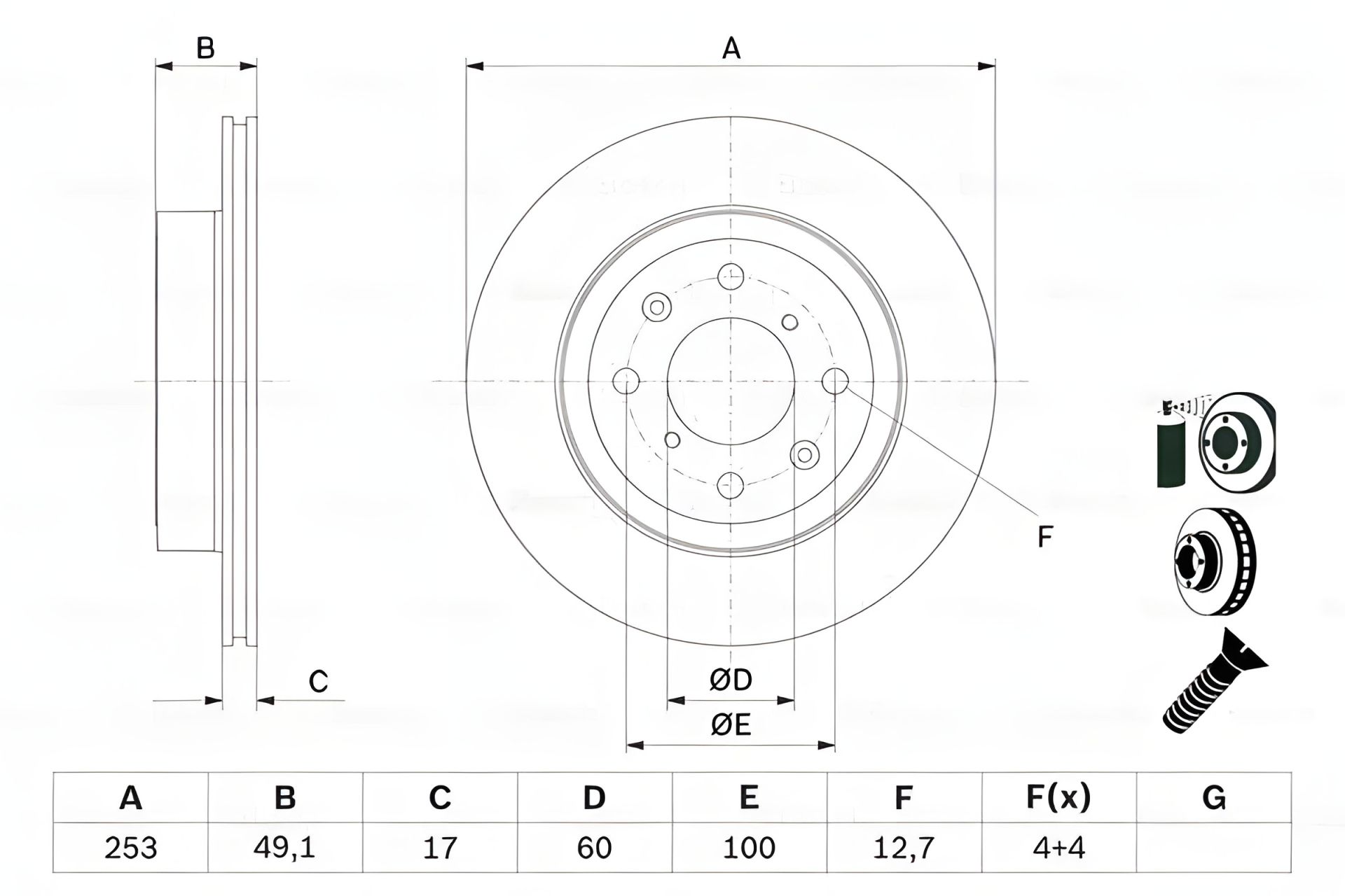 Кількість отворів: 4 Тип гальмівного диска: вентильований Додатковий артикул/додаткова інформація 2: з гвинтами Висота [мм]: 49,1 Ø фаски [мм]: 100 Діаметр центрування [мм]: 60 відповідає стандартам ECE: ECE-R90 Поверхня: з покриттям Діаметр отвору до [мм]: 12,7 Зовнішній діаметр [мм] : 253 Товщина гальмівного диска (мм) : 17 Мінімальна товщина [мм] : 15 SUZUKI 4706749 5531186G02000 5531186G02 SUBARU 4706749 5531186G02000 VAUXHALL 4706749 OPEL 4706749 SUBARU JUSTY III (G3X) 1.5 AWD (G3X413) | Хетчбек | |бензин М15А | 73 кВт | 99 к.с. | 09.2003-. SUBARU JUSTY III (G3X) 1.3 AWD (G3X413) | Хетчбек | |бензин М13А | 69 кВт | 94 к.с. | 09.2003-. SUZUKI WAGON R+ Hatchback (MM) 1.2 (RB 412) | Хетчбек | бензин Z 12 XEP | 59 кВт | 80 к.с. | 01.2005-12.2008 SUZUKI IGNIS II (MH) 1.3 4x4 (RM413) | Хетчбек | |бензин М13А | 69 кВт | 94 к.с. | 09.2003-. SUZUKI WAGON R+ Hatchback (MM) 1.3 4WD (RB 413) | Хетчбек | |бензин М13А | 69 кВт | 94 к.с. | 09.2003-. SUZUKI WAGON R+ Hatchback (MM) 1.3 (RB 413) | Хетчбек | |бензин М13А |