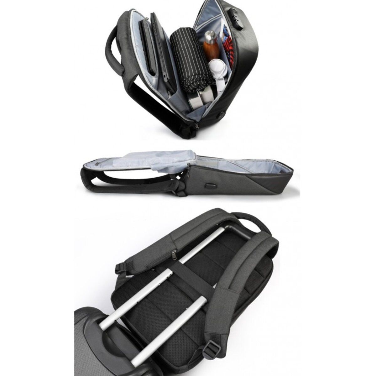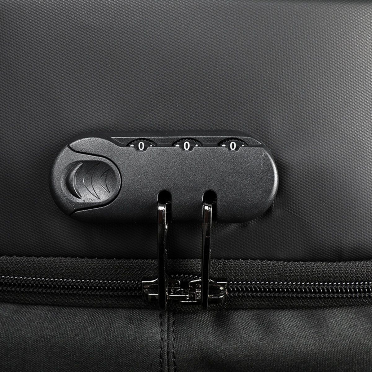 - Цей рюкзак виконаний в антизлодій-концепції — без зовнішніх кишень, із захищеними блискавками та вбудованим кодовим замком, який блокує основне відділення. Це забезпечує надійний захист від крадіжок і випадкового доступу.