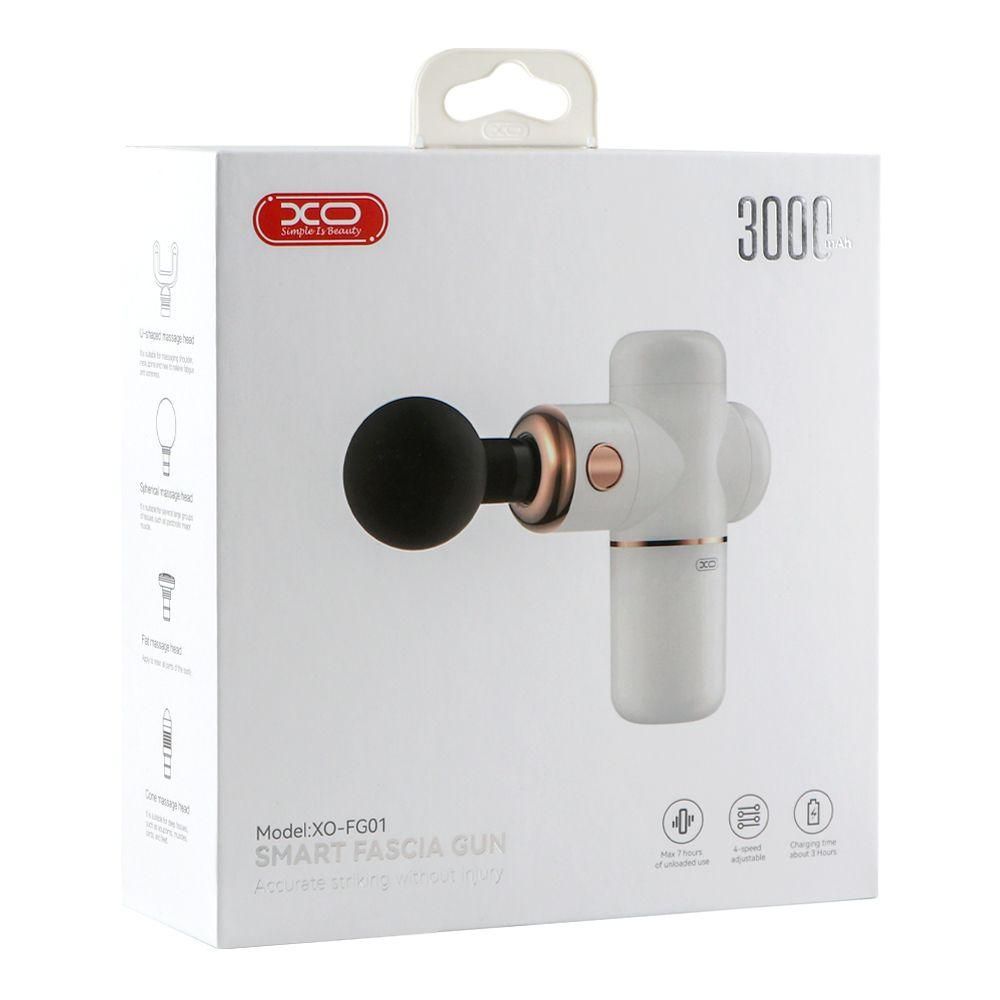 Ударний масажер XO FG01 стане ідеальним вибором для тих, хто цінує своє здоров'я й хоче насолоджуватися комфортним і ефективним масажем у будь-який час і в будь-якому місці. Він допоможе легко й без заподіяння шкоди розслабити м'язи, поліпшити циркуляцію крові та зняти напруження навіть глибоких сполучних тканин. Аксесуар виготовлений в елегантному дизайні зі стильними вставками, які лаконічно поєднуються з основним білим кольором. Завдяки компактним розмірам і невеликій вазі, його зі зручністю можна брати із собою куди завгодно, наприклад, у поїздки або в тренажерний зал. Його тиха робота та практична форма з ергономічною ручкою внесуть додатковий комфорт у повсякденну експлуатацію. Корпус пристрою надійно зібраний, виготовлений із міцної комбінації ABS пластику та полікарбонату. Його конструкцією передбачена можливість простої зміни основної кулястої насадки на одну з чотирьох додаткових для досягнення найбільшого ефекту під час масажу певних зон тіла. Масажер обладнаний LED-індикаторами та функційною кнопкою для увімкнення й настроювання інтенсивності в 1 з 4 режимів роботи. Виведення ритмічних поступальних рухів здійснюється сучасним електродвигуном потужністю 40W. Джерелом живлення для нього слугує вбудований акумулятор ємністю 3000mAh. Процес його заряджання через роз'єм Type-C із силою струму 2 A за напруги 5V не займе більш ніж 3 години. Масажер комплектується інструкцією, кабелем Type-C для заряджання та 4 насадками.