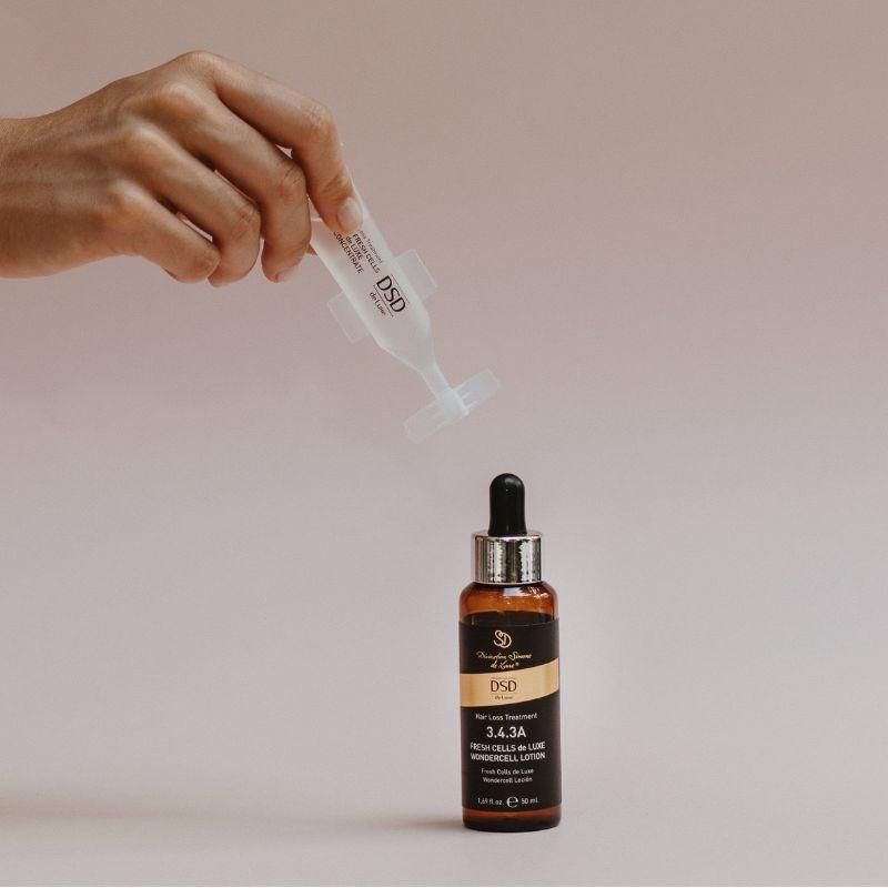 DSD De Luxe 3.4.3А Fresh Cells Wondercell Lotion робить волосся густішим і сильнішим уже за 2 місяці, знижує випадання на 70-80%, стимулює новий ріст і покращує густоту. Під час курсового використання пасма стають еластичними та здоровими, шкіра голови очищається, зачіска має об'ємний вигляд без подразнення або жирності.