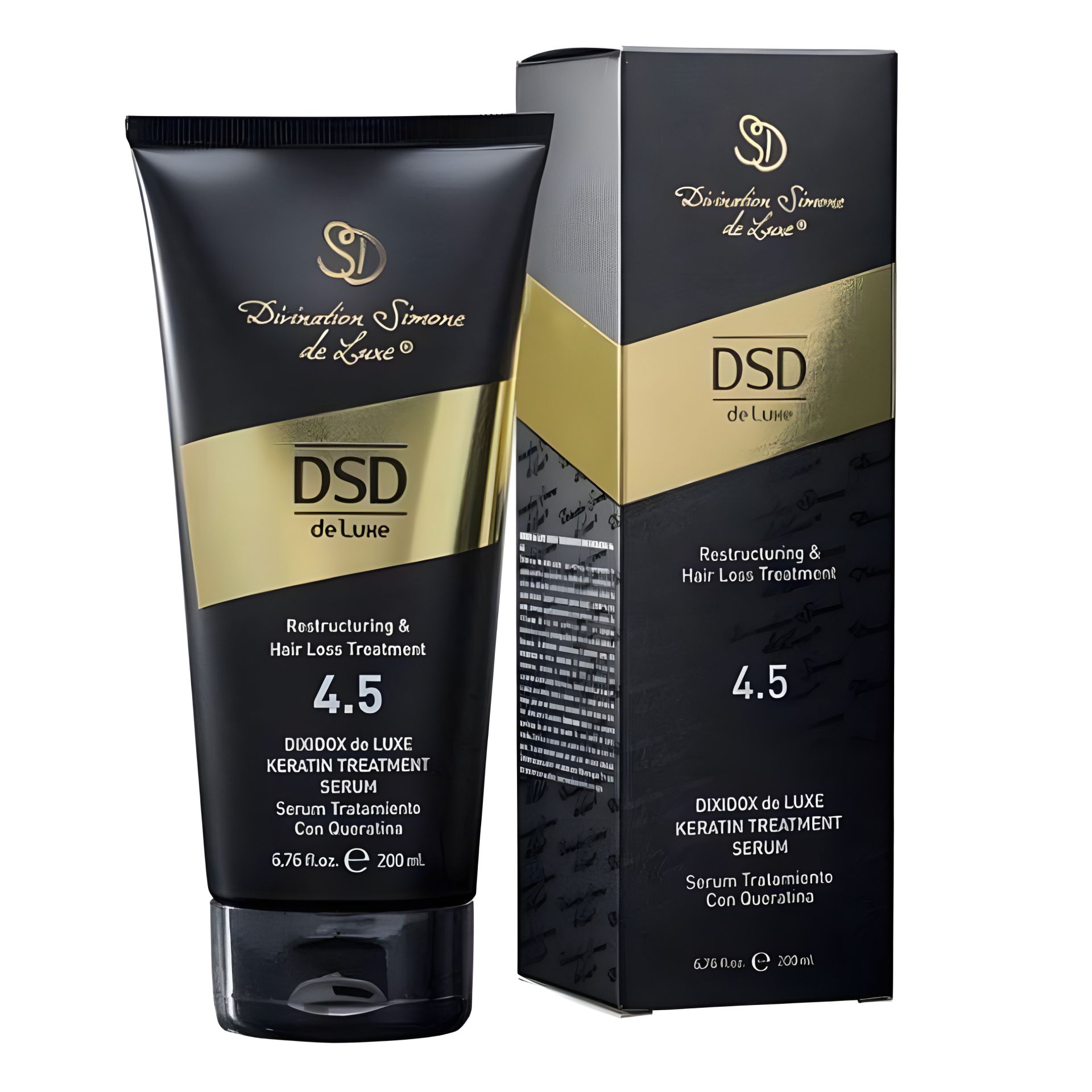 DSD De Luxe 4.5 Dixidox Keratin Treatment Serum — багатофункціональна незмивна сироватка з кератином і активними екстрактами для відновлення пошкодженого волосся і стимуляції його росту; проникає в структуру, заповнюючи дефекти та зміцнюючи фолікули, покращує кровообіг і продовжує фазу анагену, підходить для всіх типів, включно з ослабленими та фарбованими, забезпечує захист від термічного впливу та зовнішніх чинників без обважнення.