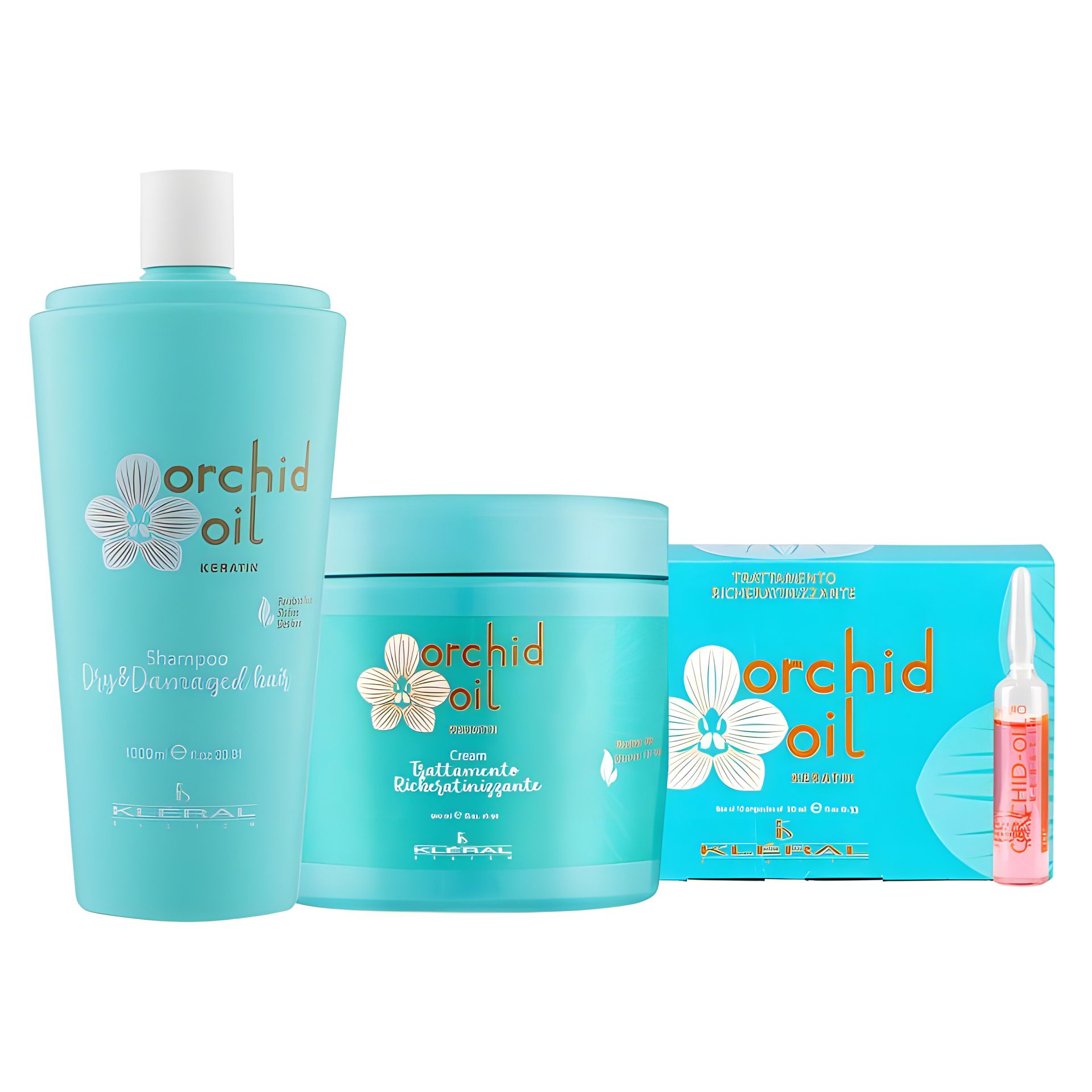 Набір KLERAL System Orchid Oil TRIO призначений для комплексного догляду за сухим, ослабленим і пошкодженим волоссям; шампунь м'яко очищає без сульфатів, збагачений олією орхідеї та кератином, маска глибоко зволожує та реструктуризує структуру, ампули забезпечують інтенсивне живлення прокератином для відновлення лусочок підходить для всіх типів, включно з фарбованими та після процедур, забезпечує блиск і еластичність без парабенів, SLS і SLES.