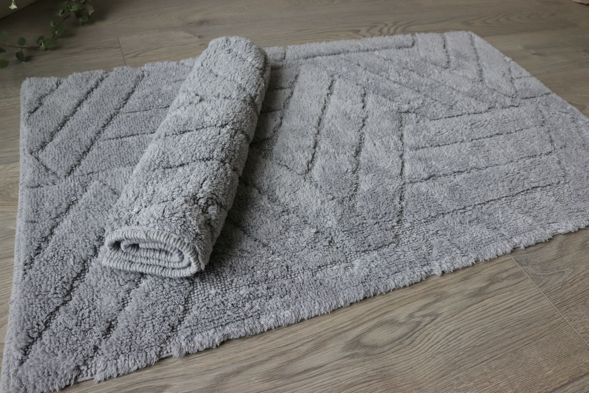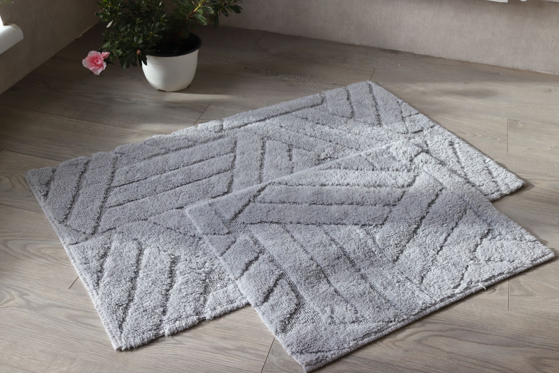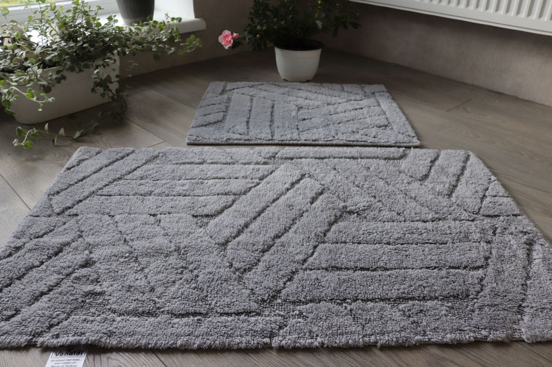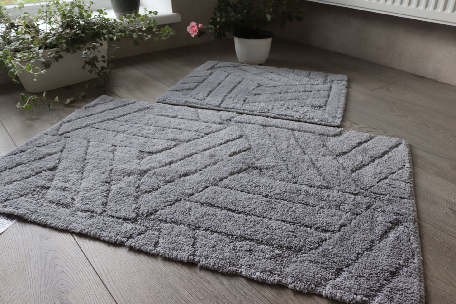 Набір килимків для ванної та туалету зі 100% бавовни. Цей натуральний матеріал дарує неймовірні відчуття при контакті зі стопою, а також вбирає багато води. У наборі два прямокутних килимки 60*100 см і 50*60 см. Вирізу під унітаз немає. Прямокутні форми дозволяють універсально їх використовувати й комбінувати. На звороті килимки основи не мають й не потребують. Можливе прання у пральній машині й використання на підлозі з підігрівом.