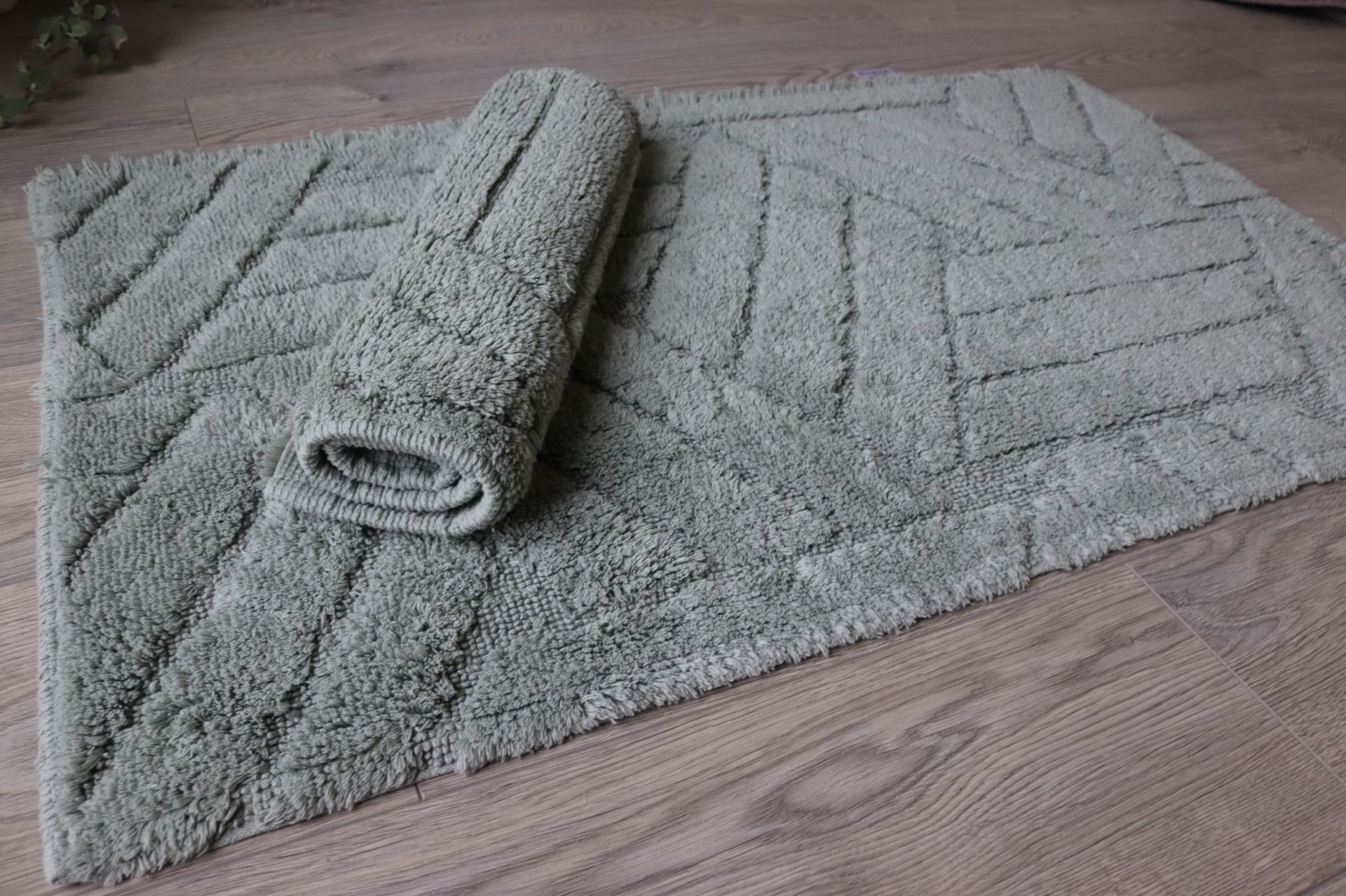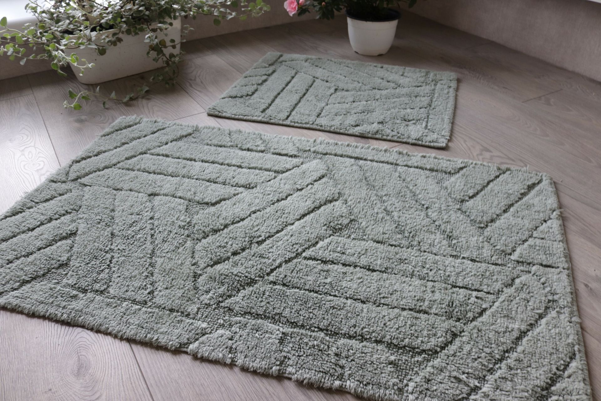 Набір килимків для ванної та туалету зі 100% бавовни. Цей натуральний матеріал дарує неймовірні відчуття при контакті зі стопою, а також вбирає багато води. У наборі два прямокутних килимки 60*100 см і 50*60 см. Вирізу під унітаз немає. Прямокутні форми дозволяють універсально їх використовувати й комбінувати. На звороті килимки основи не мають й не потребують. Можливе прання у пральній машині й використання на підлозі з підігрівом.