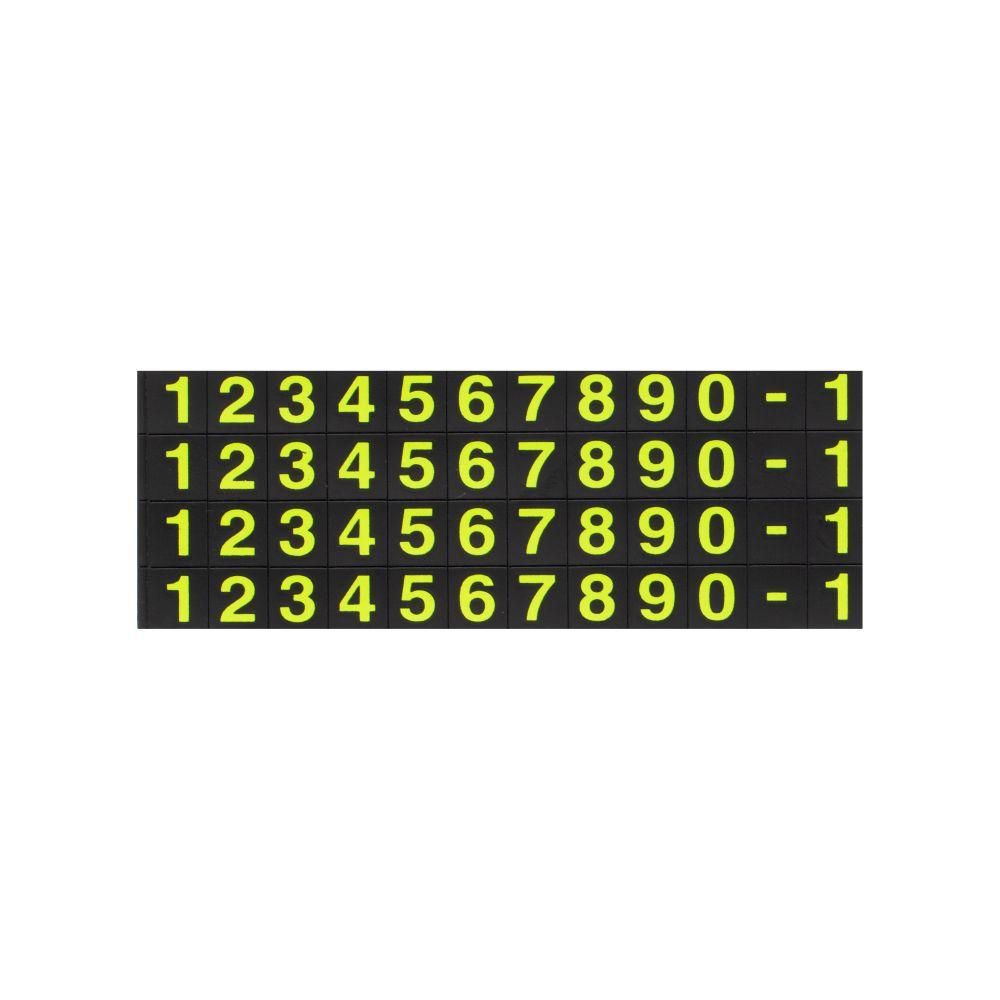 До комплекту входить 2 пластини цифр від 0 до 9 з чорточкою. Гнучкі прогумовані стикери кріпляться на металеву стрічку аксесуара з допомогою магнітної основи та мають особливе покриття, яке захищає їх від блякнення на сонці. Цифри виконані флуоресцентною фарбою, завдяки чому вони світяться в темряві.