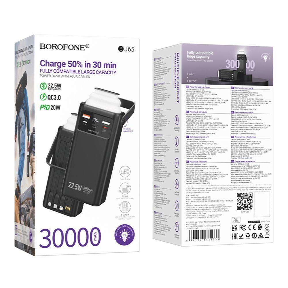 Power Bank Borofone BJ65 High — це надійний супутник для активного відпочинку та помічник в екстрених ситуаціях, який дає змогу заряджати необхідні пристрої навіть далеко від електричних розеток. Його практична конструкція позбавляє потреби використання сторонніх кабелів і в поєднанні з підтримкою протоколів швидкого заряджання забезпечує сумісність із більшістю сучасних ґаджетів. Особливості та переваги повербанка Borofone BJ65 High: • Оригінальний дизайн із практичними деталями, округленими кутами та стильною глянсовою панеллю з функціональними елементами. • Невеликі розміри (70×46×152 мм) і вага (670 г) — у поєднанні з практичною ручкою забезпечують зручне перенесення. • Міцний корпус із надійної комбінації ABS-пластику та вогнестійкого полікарбонату. • 4 плоских вбудованих кабелі з різними інтерфейсами, які акуратно укладені в спеціально відведені слоти на задній панелі. • Енергоефективний літій-полімерний акумулятор ємністю 30000mAh (111Wh). • Яскравий LED-ліхтар із функцією SOS і складаним силіконовим дифузором, який ефективно розсіює світло на всі 360°. • Кнопка для увімкнення ліхтаря та LED-дисплея, який зображає рівень заряду у відсотках та активність функції швидкого заряджання. • 2 вхідні роз'єми (Lightning і кабель USB-A), 5 вихідних роз'ємів (USB-A1/A2 і 3 кабелі Type-C/IP/Micro) і роз'єм Type-C, який може працювати на вхід і вихід. • Максимальна потужність на виході роз'єму Type-C: 20W (PD/QC/FCP/AFC). • Максимальна потужність на виході кабелю Type-C: 22.5W (QC/SCP/FCC/AFC). • Максимальна потужність на виході роз'єму USB-A1: 22.5W (QC/SCP/FCP/AFC). • Максимальна потужність на виході роз'єму USB-A2 і кабелів Lightning/Micro: 10W. • Максимальна потужність на вході кабелю USB-A: 10W (5V/2A). • Максимальна потужність на вході роз'ємів Type-C і Lightning: 18W. • Загальна максимальна потужність на вході: 10W (5V/2A). • Багаторівнева система захисту від перезаряджання, перерозряджання, перегрівання, перевантаження, стрибків напруги та короткого замикання. Універсальний і функціональний повербанк Borofone BJ65 High гарантує безперебійну роботу пристроїв, хоч би де був його власник.