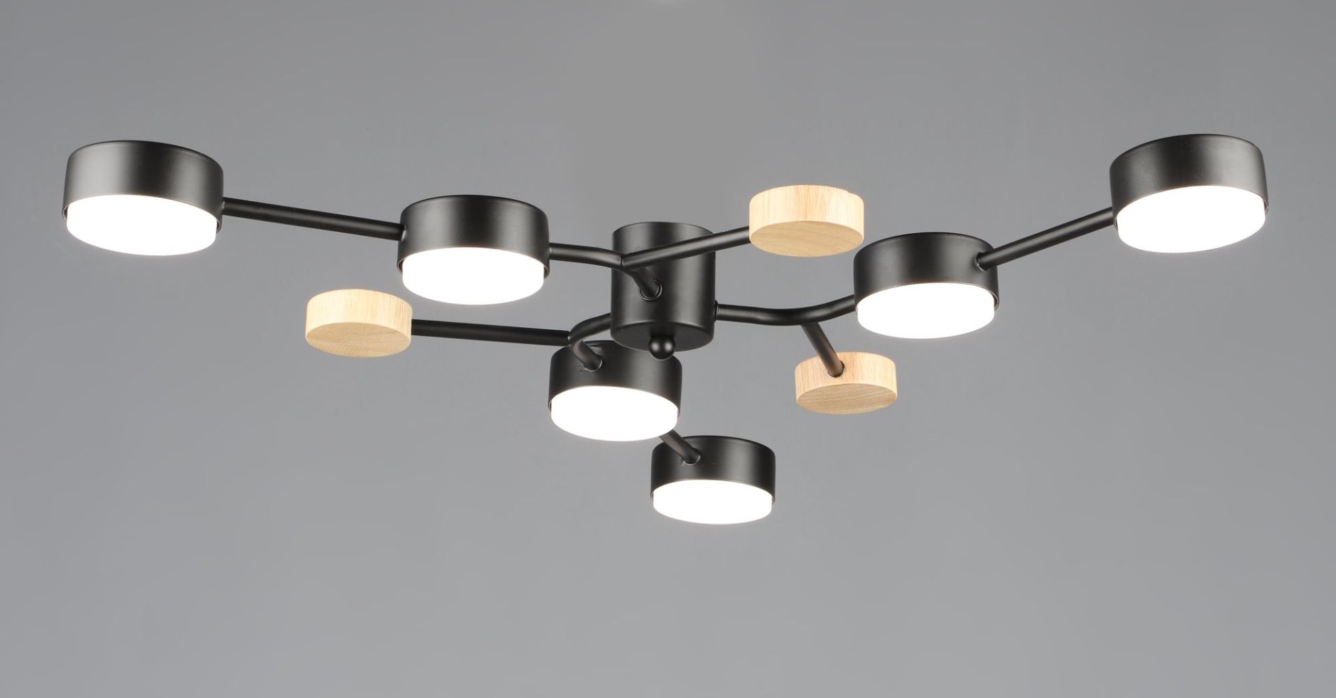Люстра виконана у стильному контрасті чорного металу та декоративних елементів дерева. Конструкція з шести джерел світла забезпечує ефективне та рівномірне освітлення. Завдяки патронам типу GX53 ця модель ідеально підходить для використання сучасних та економічних LED-ламп.