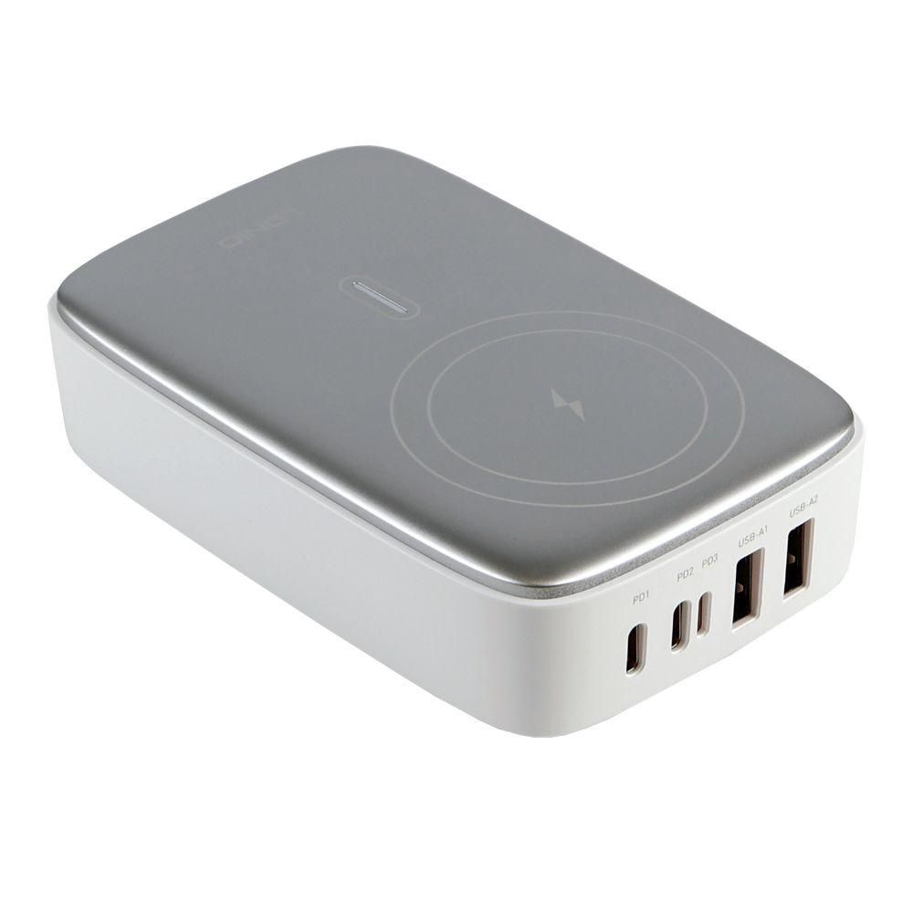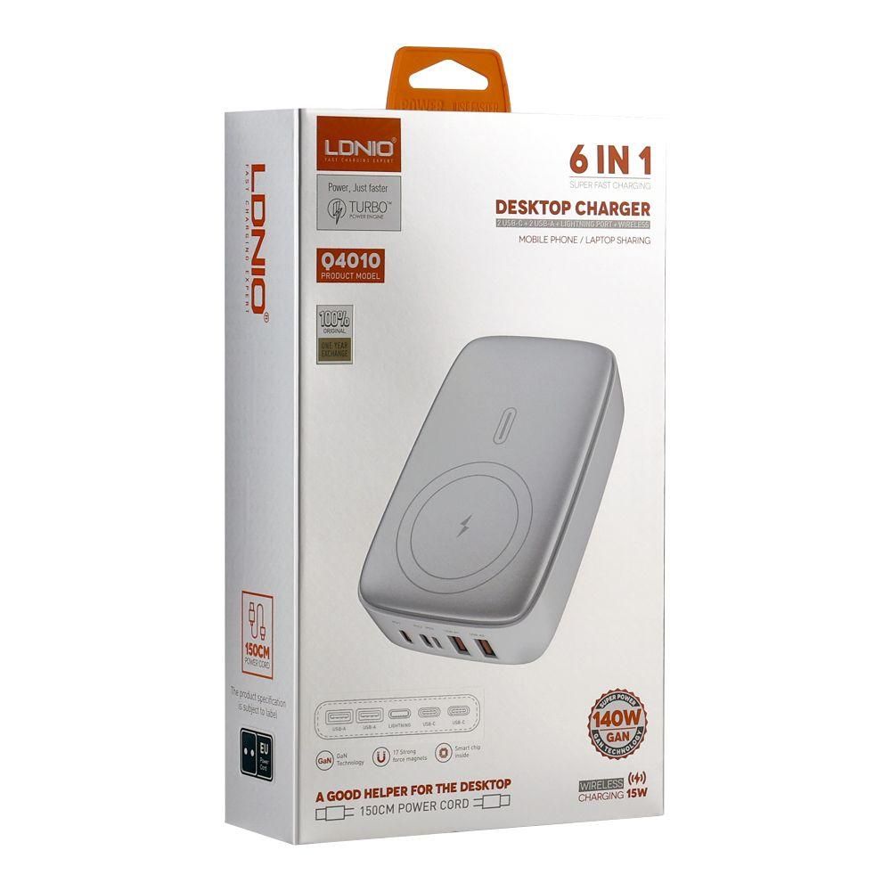 Мережевий зарядний пристрій LDNIO Q4010 — це багатофункціональне рішення, розроблене для тих, хто використовує техніку максимально активно та вимагає постійної готовності своїх пристроїв. Заснована на технології GaN, вона робить процес заряджання простішим і швидшим, пропонуючи зручність під'єднання та стабільність живлення, що особливо важливо в сучасному ритмі життя. Особливості та переваги зарядного пристрою LDNIO Q4010: • Сучасний дизайн зі стильним забарвленням, практичною формою та зручно розташованими функціональними елементами. • Компактні розміри: 118×35×75мм, — не займає багато місця на столі та з легкістю поміщається в сумці або рюкзаку. • Якісні електронні компоненти та надійне складання корпусних деталей з ударостійкого полікарбонату. • Роз'єм IEC для знімного мережевого кабелю завдовжки 1.5 м з мережевою вилкою стандарту EU. • Широкий діапазон вхідної напруги: 100-240V (AC, 50/60Hz, 2.5A макс.). • Панель бездротової зарядки Qi з котушкою з чистої міді та 17 магнітами N52 для фіксації сумісних пристроїв. • Широка варіативність потужності на виході бездротової зарядки: 5, 7.5, 10 і 15W. • Роз'єм Lightning (L), 2 роз'єми Type-C (C1 і C2) і 2 роз'єми USB-A (A1 і A2). • Максимальна потужність на виході роз'єму Type-C1: 65 W (5V/3A, 9V/3A, 12V/3A, 15V/3A, 20V/3.25A, 3.3-11V/5A та 3.3-21V/3.25A для PPS). • Максимальна потужність на виході роз'ємів Type-C2 і Lightning: 35 W (5V/3A, 9V/3A, 12V/2.92A, 15V/2.33A, 20V/1.75A і 3.3-11V/3A для PPS). • Максимальна потужність на виході роз'єму USB-A1: 30 W (5V/3A, 9V/3A, 12V/2.5A). • Максимальна потужність на виході роз'єму USB-A2: 25 W (5V/3A, 9V/2.77A, 12V/2.08A). • Загальна максимальна потужність на виході: 140 W (C1+L+A2+Qi = 65 W + 35 W + 25 W + 15 W). • Підтримка швидкого заряджання за протоколами PD2.0/3.0, QC5/4+/3.0/2.0, BC1.2, AFC, FCP, SCP, DCP та іншим. • 9-рівнева система захисту від перевантажень за струмом, напругою та потужністю, перезаряджання, перегрівання, короткого замикання, електромагнітного випромінювання, низької напруги та захист із функцією відновлення під час перевантаження. Зарядний пристрій LDNIO Q4010 об'єднує дротову й бездротову зарядку, пропонуючи максимальну зручність і стабільність живлення.