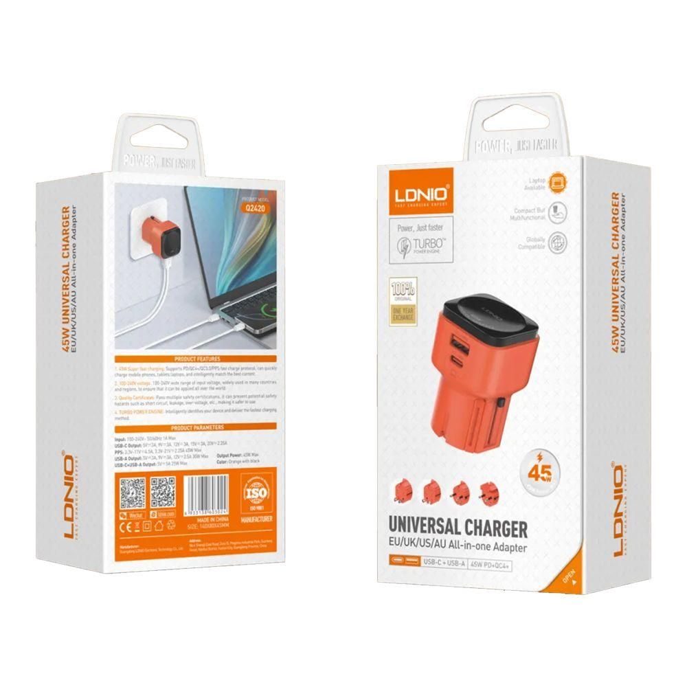 Мережевий зарядний пристрій LDNIO Q2420 — це компактний і технологічний аксесуар, що ґрунтується на сучасній GaN-технології, яка дає змогу скоротити розміри адаптера без шкоди для його ефективності. Вона забезпечує стабільне та швидке підзаряджання широкого спектра портативних ґаджетів, не перегрівається й підходить для постійного використання в будь-яких умовах. Особливості та переваги зарядного пристрою LDNIO Q2420: • Сучасний дизайн із яскравим, привабливим забарвленням, практичними деталями та стильно виготовленою панеллю торця. • Компактні розміри: 42×42×56мм, — з легкістю поміститься в кишені, забезпечуючи зручне використання в будь-якому місці. • Якісні електронні компоненти та надійне складання корпусу з міцного ABS-пластику та вогнестійкого полікарбонату. • 2 висувні мережеві вилки з практичною конструкцією, яка забезпечує сумісність із розетками стандарту EU, AU, UK і US. • Широкий діапазон вхідної напруги: 100-240V (AC, 50/60Hz, 1A макс.). • Роз'єми Type-C і USB-A, які зручно розташовані на бічній грані та можуть використовуватися одночасно. • Максимальна потужність на виході роз'єму Type-C: 45 W (5V/3A, 9V/3A, 12V/3A, 15V/3A і 20V/2.25A). • Підтримка технології PPS з напругою і силою струму на виході роз'єму Type-C 3.3-11V/4.5A і 3.3-21V/2.25A. • Максимальна потужність на виході роз'єму USB-A: 30 W (5V/3A, 9V/3A і 12V/2.5A). • Загальна максимальна потужність на виході: 25 W (5V/5A). • Підтримка швидкого заряджання за протоколами PD, QC3.0, QC4+, SCP, AFC та іншим. • 9-рівнева система захисту від перевантажень за струмом, напругою та потужністю, перезаряджання, перегрівання, короткого замикання, електромагнітного випромінювання, ударів блискавки та захист із функцією відновлення під час перевантаження. • Комплектується надійним, практичним кабелем Type-C — Type-C. Використання GaN-технології дало змогу досягти видатної ефективності в компактному форм-факторі, роблячи LDNIO Q2420 надійним супутником у повсякденному цифровому житті.