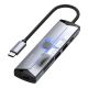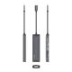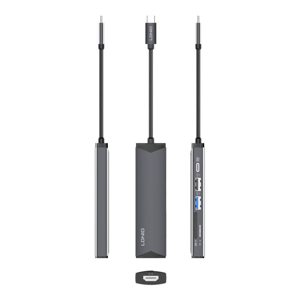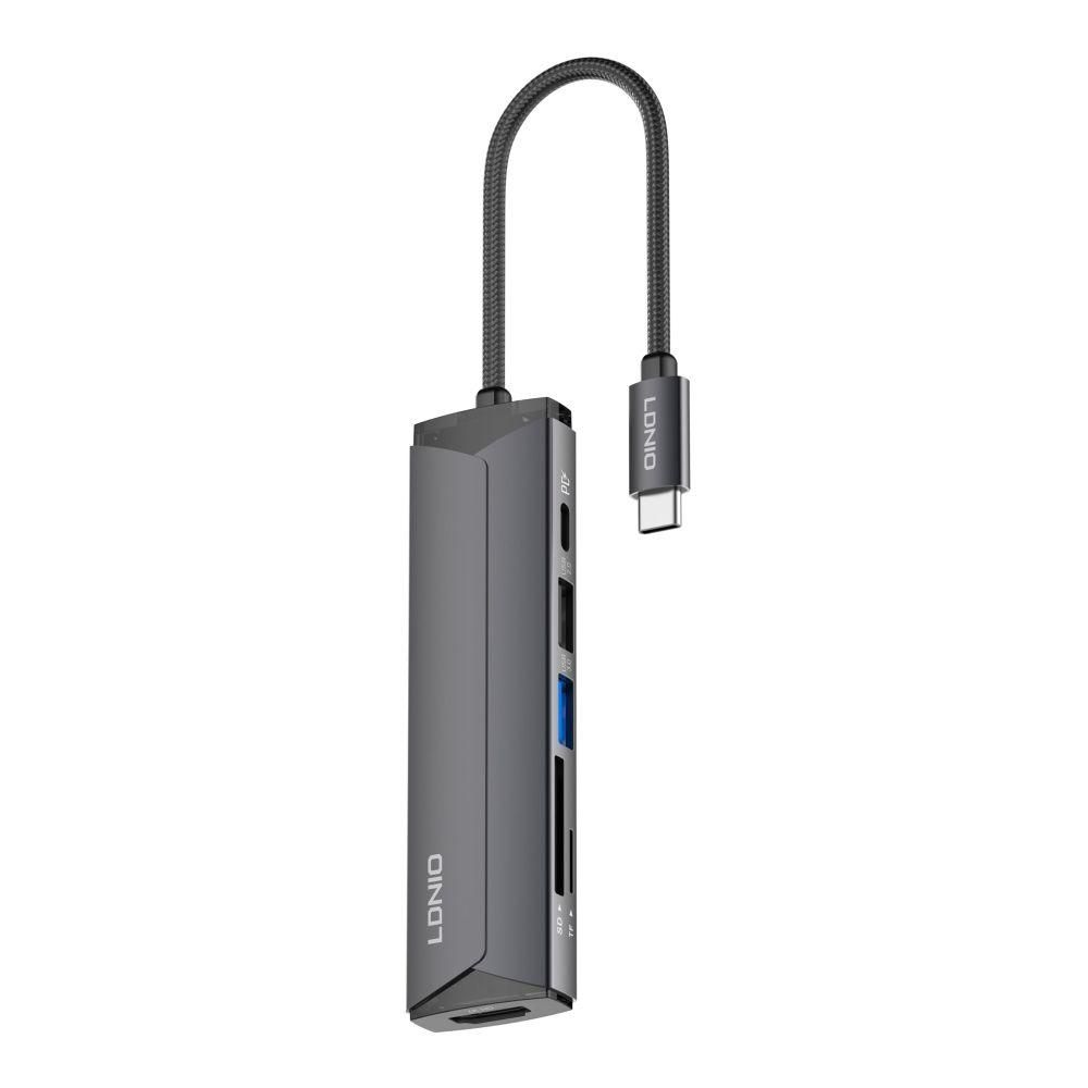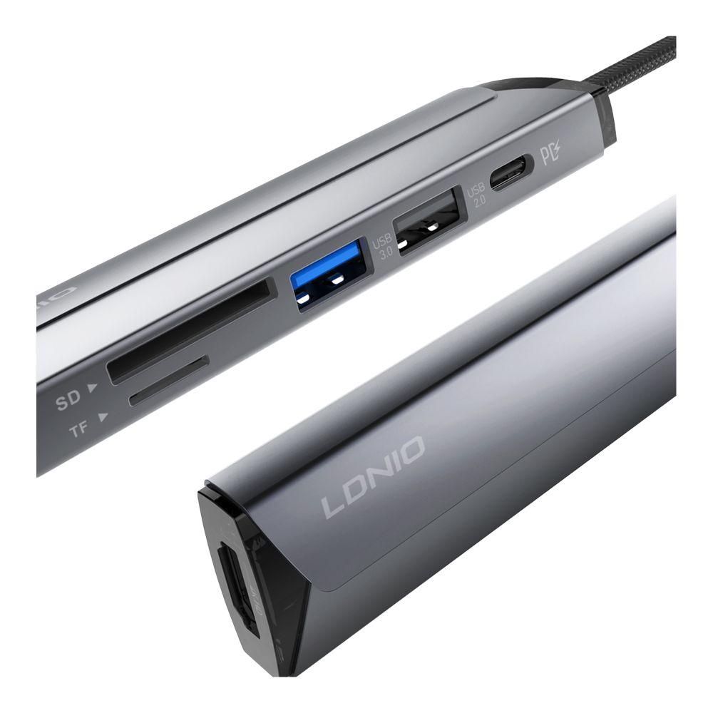USB Hub LDNIO DS-56H забезпечує безпрецедентну універсальність, даючи змогу під'єднати безліч периферійних пристроїв через один компактний хаб. Він гарантує стабільне передавання даних, швидке заряджання та високоякісне виведення зображення, що робить його незамінним аксесуаром для ефективного виконання будь-яких завдань. Особливості та переваги хаба LDNIO DS-56H: • Вишуканий дизайн зі стильним забарвленням, оригінальними деталями та зручно розташованими інтерфейсами. • Компактні розміри: 230×29×14 мм, — не заважає і не займає багато місця на робочому столі, у сумці або рюкзаку для ноутбука. • Якісні електронні компоненти, ударостійкий корпус з алюмінієвого сплаву та деталі з міцного пластику. • Вбудований кабель завдовжки 17 см із сучасним роз'ємом Type-C (male) для зручного під'єднання до сумісних пристроїв. • Вхідна напруга: 5V за сили струму 3A, 15V за 3A і 20V за 5A. • 2 слоти для карт пам'яті SD і TF, а також 4 роз'єми типу female: USB-A 3.0, USB-A 2.0, Type-C 2.0 і HDMI. • Підтримка передавання даних зі швидкістю до 5Gbps через порт USB-A 3.0. • Підтримка передавання відео на зовнішній монітор у форматі 4K із частотою 30Hz через роз'єм HDMI. • Підтримка передавання даних і швидкого заряджання за протоколом PD3.0 з максимальною потужністю 100 W через роз'єм Type-C. • Підтримка передавання даних зі швидкістю до 480Mbps через роз'єм USB-A 2.0. • Багаторівнева система захисту від витоку струму, загоряння, перевантажень за струмом і напругою, короткого замикання, перегрівання. • Підтримка технології Plug and Play і сумісність із найпоширенішими ОС (Windows, Mac OS, Android). Завдяки розширеним можливостям і ефективній системі захисту, хаб LDNIO DS-56H забезпечує комфортну роботу в будь-яких умовах — від офісу до домашнього використання.