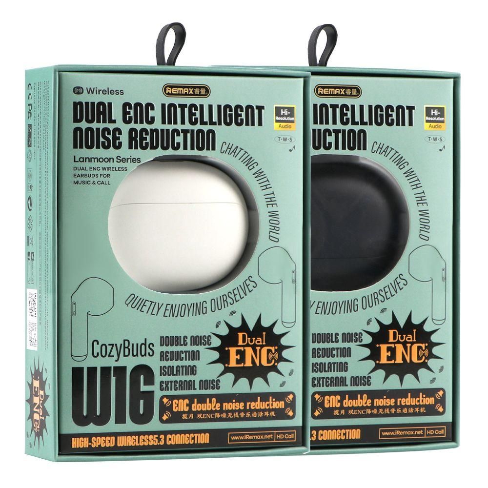 Блютуз стереогарнітура Remax W16 — це неймовірно легкі TWS-навкладники із серії CozyBuds від Remax, які вирізняються чудовою якістю звуку та функцією шумозаглушення. Ця модель стане чудовим вибором для меломанів і геймерів, зробить здійснення дзвінків зі смартфона максимально комфортним у будь-яких умовах. Завдяки стильному дизайну й ергономічній формі, навушники лаконічно доповнять будь-який вигляд і можуть використовуватися впродовж усього дня без відчуттів дискомфорту та навантаження. Вони щільно розташовуються у вухах і не випадають навіть під час активних рухів. Попри свої невеликі розміри та вагу, вони обладнані акумуляторами ємністю 35mAh і великими драйверами діаметром 13 мм, які відтворюють HD звук із глибокими басами, чистими високими та насиченими середніми частотами. Час їхньої безперервної роботи в режимі відтворення може досягати потужних 5 годин. Також кожен із навушників забезпечений чутливим мікрофоном, LED-індикатором і сенсорним керуванням для комфортного настроювання, перемикання треків і приймання дзвінків. Стабільне бездротове з'єднання гарнітури з джерелом звуку в радіусі до 10 метрів і передавання аудіосигналу з мінімальною затримкою забезпечуються сучасним модулем Bluetooth V5.3 з підтримкою протоколів A2DP, HFP, HSP і AVRCP. Ефективна фільтрація сторонніх шумів здійснюється інтелектуальною технологією подвійного шумозаглушення ENC. Компактний зарядний кейс навушників має обтічну форму, приємну на дотик матову поверхню та практичну конструкцію, яка неабияк спростить їхнє виймання. Його акумулятор ємністю 300mAh дасть змогу повністю зарядити навушники 3-4 рази. Пристрій комплектується інструкцією й кабелем Type-C для заряджання.